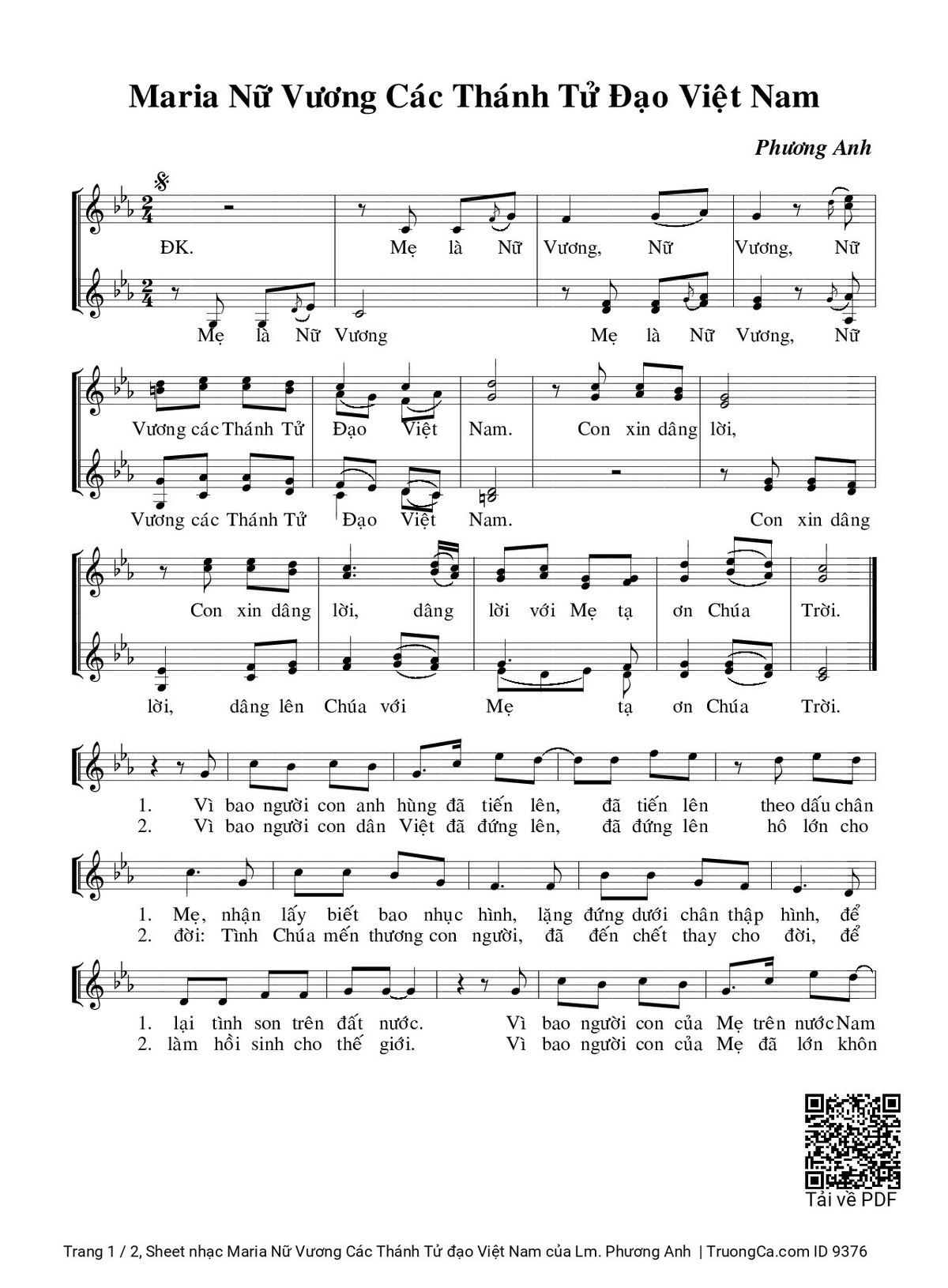 Điệp khúc. Mẹ là Nữ Vương, Nữ Vương, Nữ Vương các Thánh Tử Đạo Việt Nam. Con xin dâng lời, con xin dâng lời, dâng lời với Mẹ tạ ơn Chúa Trời.