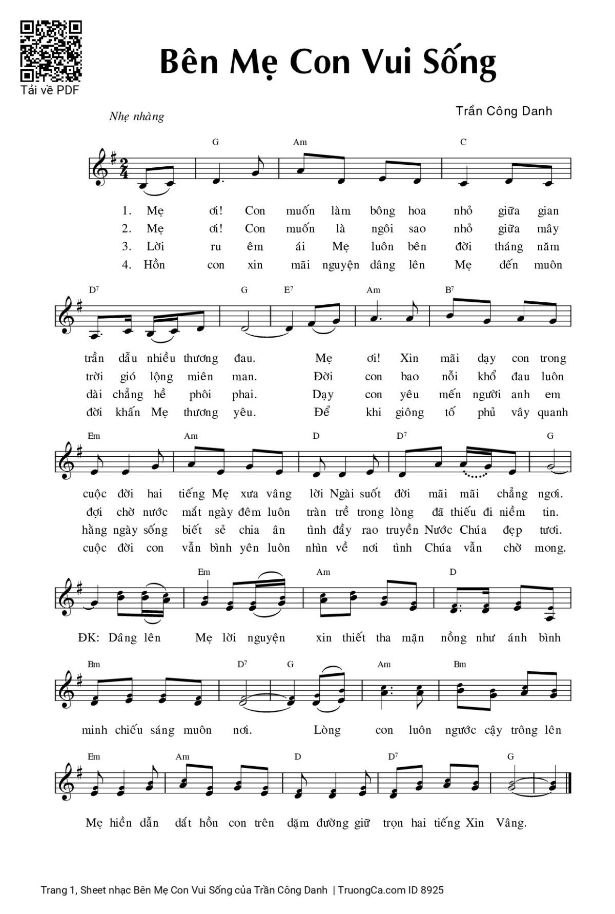 Transposition is the process of moving a song's melody and chords up or down in pitch by a constant interval. The direction of the transposition tool is indicated by a plus (+) sign for up and a minus (-) sign for down. Hover mouse over chords signs to see the chords chart of Bên Mẹ Con Vui Sống song.