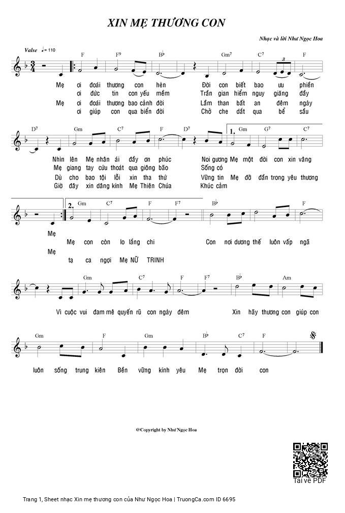 Như Ngọc Hoa Mẹ ơi đoái thương con hèn Đời con biết bao ưu phiền [PDF] [Sheet] [Lyrics] [Mp4/Midi]