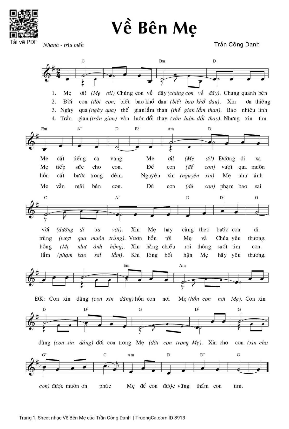 Transposition is the process of moving a song's melody and chords up or down in pitch by a constant interval. The direction of the transposition tool is indicated by a plus (+) sign for up and a minus (-) sign for down. Hover mouse over chords signs to see the chords chart of Về Bên Mẹ song.