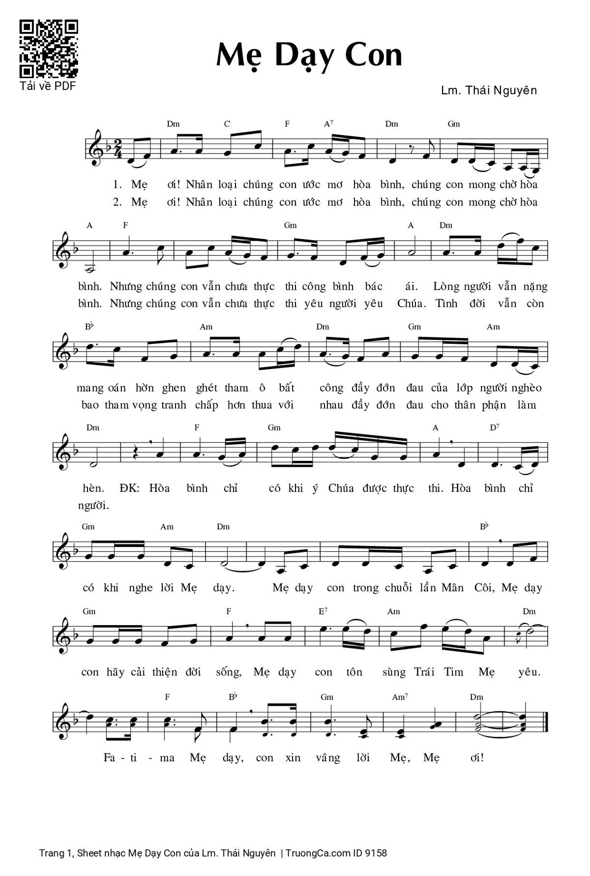 Điệp khúc: Hòa bình chỉ có khi ý Chúa được thực thi. Hòa bình chỉ có khi nghe lời mẹ dạy. Mẹ dạy con trong chuỗi lần mân côi. Mẹ dạy con hãy cải thiện đời sống. Mẹ dạy con tôn sung trái tim Mẹ yêu. Ma-ri-a Mẹ dạy, con xin vâng lời Mẹ, Mẹ ơi