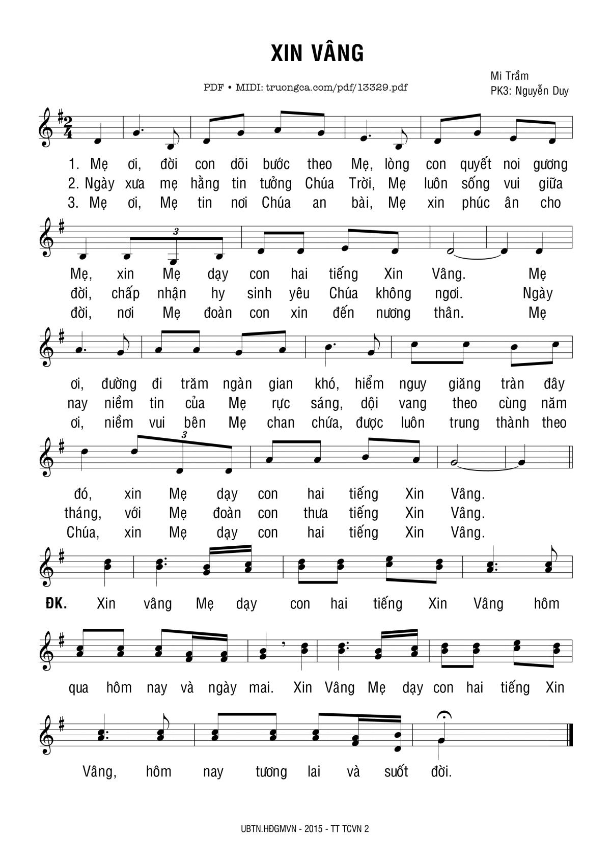 Điệp khúc. Xin vâng, Mẹ dạy con hai tiếng Xin Vâng hôm qua hôm nay và ngày mai. Xin vâng, Mẹ dạy con hai tiếng Xin Vâng, hôm nay tương lai và suốt đời.