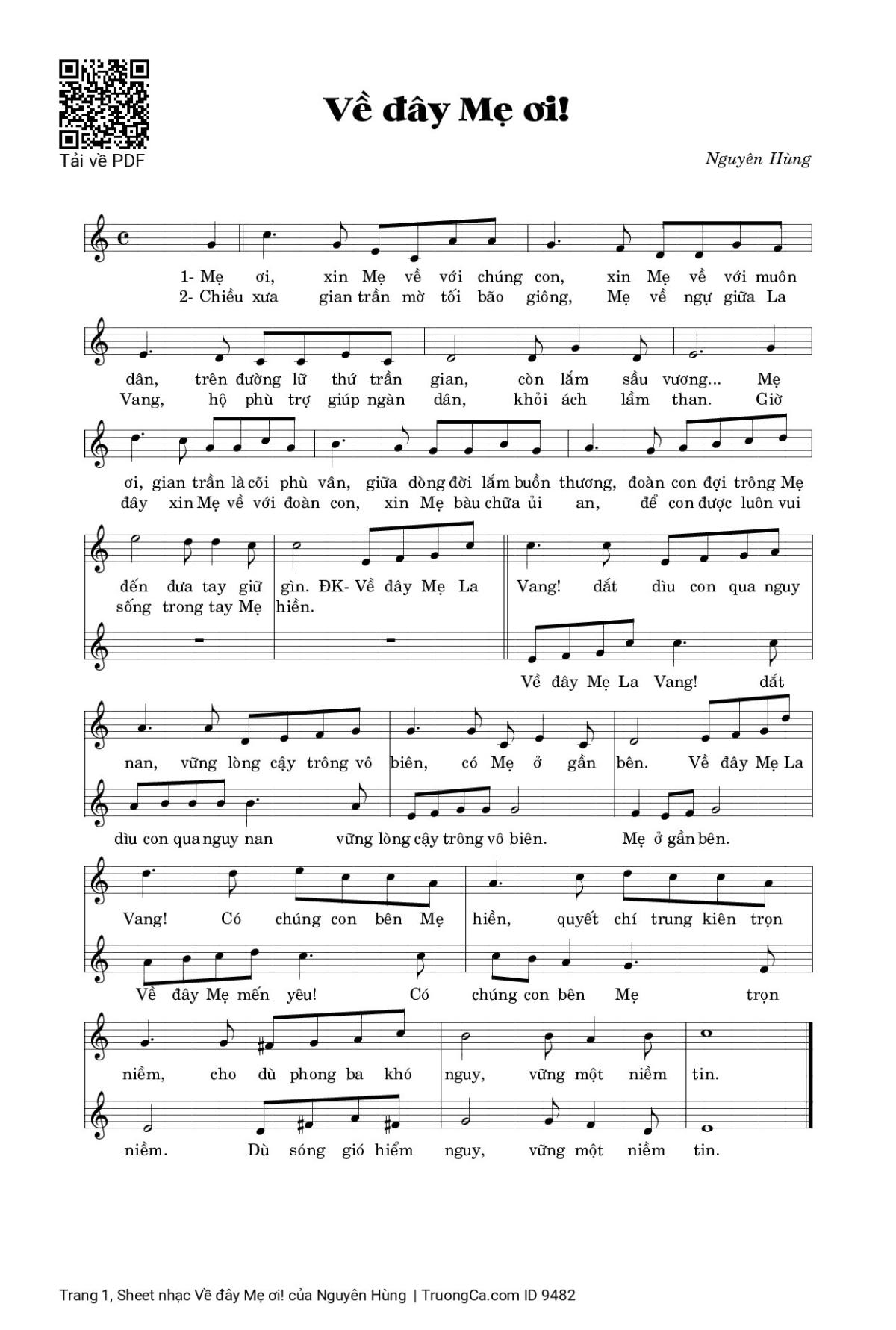 Điệp khúc. Về đây Mẹ La Vang! dắt dìu con qua nguy nan, vững lòng cậy trông vô biên, có Mẹ ở gần bên. Về đây Mẹ La Vang! Có chúng con bên Mẹ hiền, quyết chí trung kiên trọn niềm, cho dù phong ba khó nguy, vững một niềm tin.