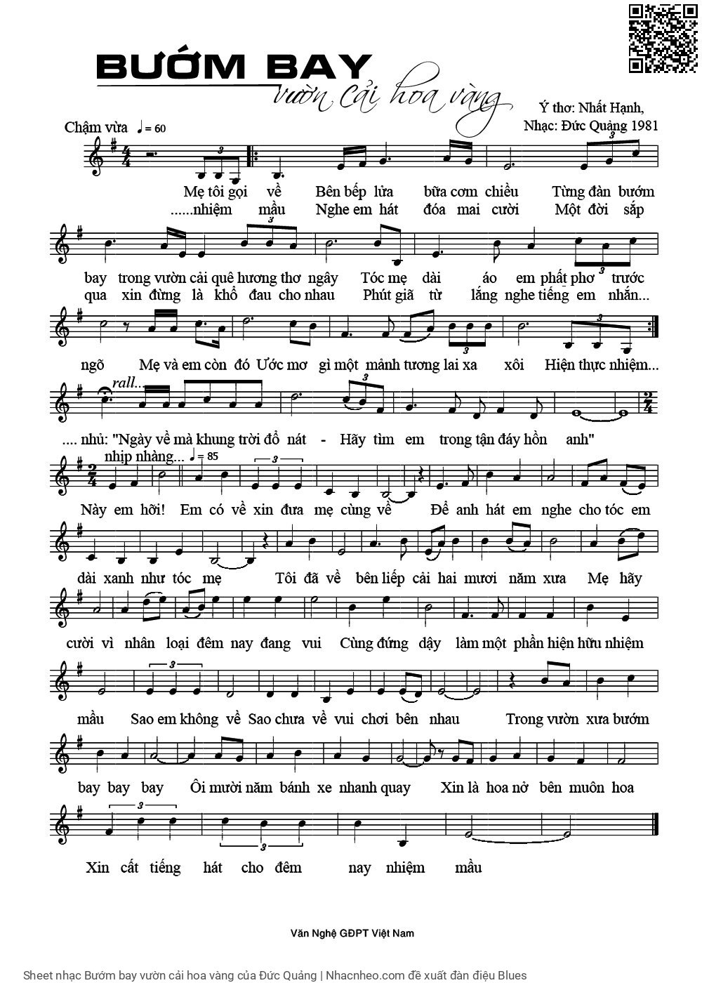 Transposition is the process of moving a song's melody and chords up or down in pitch by a constant interval. The direction of the transposition tool is indicated by a plus (+) sign for up and a minus (-) sign for down. Hover mouse over chords signs to see the chords chart of Bướm bay vườn cải hoa vàng song.