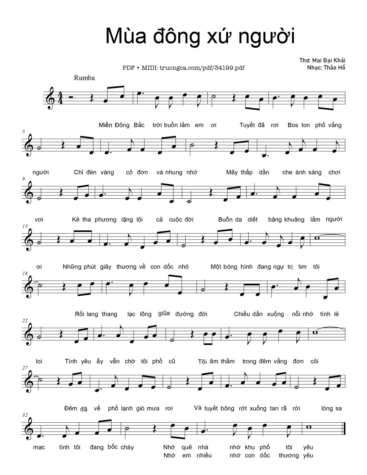 Thảo Hồ Miền Đông Bắc trời buồn lắm em ơi Tuyết đã rơi Bos ton phố vắng người [PDF] [Sheet] [Lyrics] [Mp4/Midi]