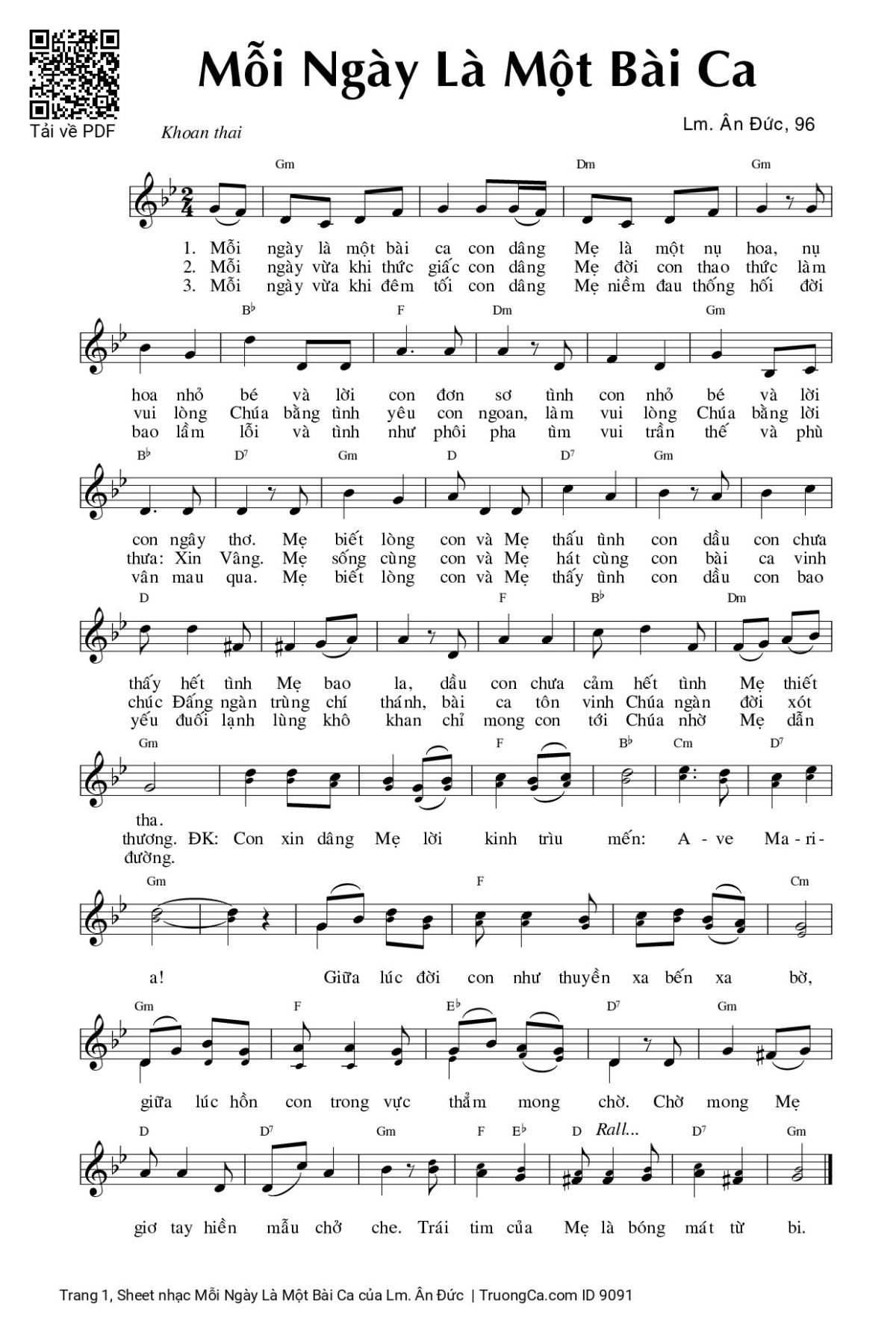 1. Mỗi ngày là một bài ca con dâng Mẹ là một nụ hoa, nụ hoa nhỏ bé và lời và lời con đơn sơ, tình con nhỏ bé và lời con ngây thơ. Mẹ biết lòng con và Mẹ thấu tình con dầu con chưa thấy hết tình Mẹ bao la, dầu con chưa cảm hết tình Mẹ thiết tha.