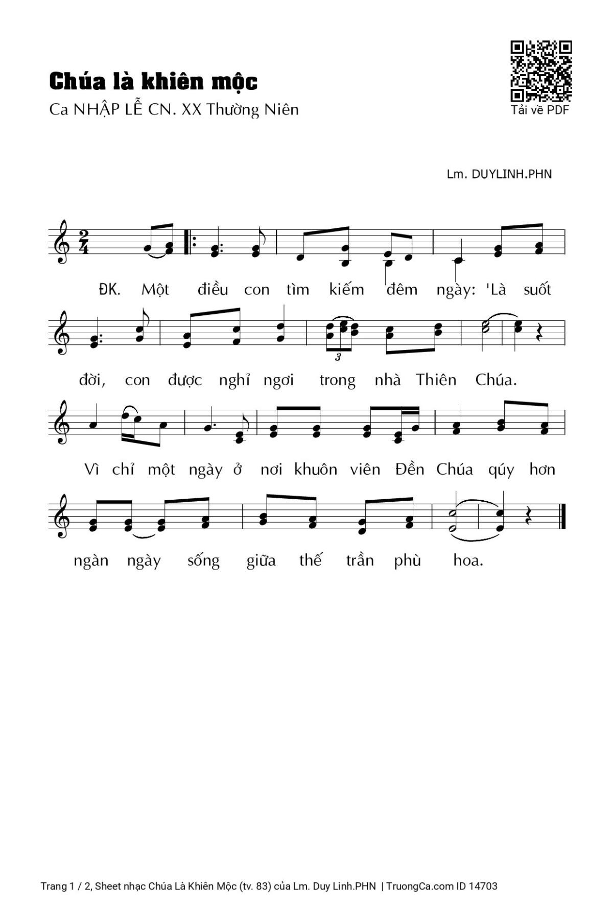 Điệp khúc. Một điều con tìm kiếm đêm ngày: “Là suốt đời, con được nghỉ ngơi trong nhà Thiên Chúa. Vì chỉ một ngày ở nơi khuôn viên Đền Chúa quý hơn ngàn ngày sống giữa thế trần phù hoa.