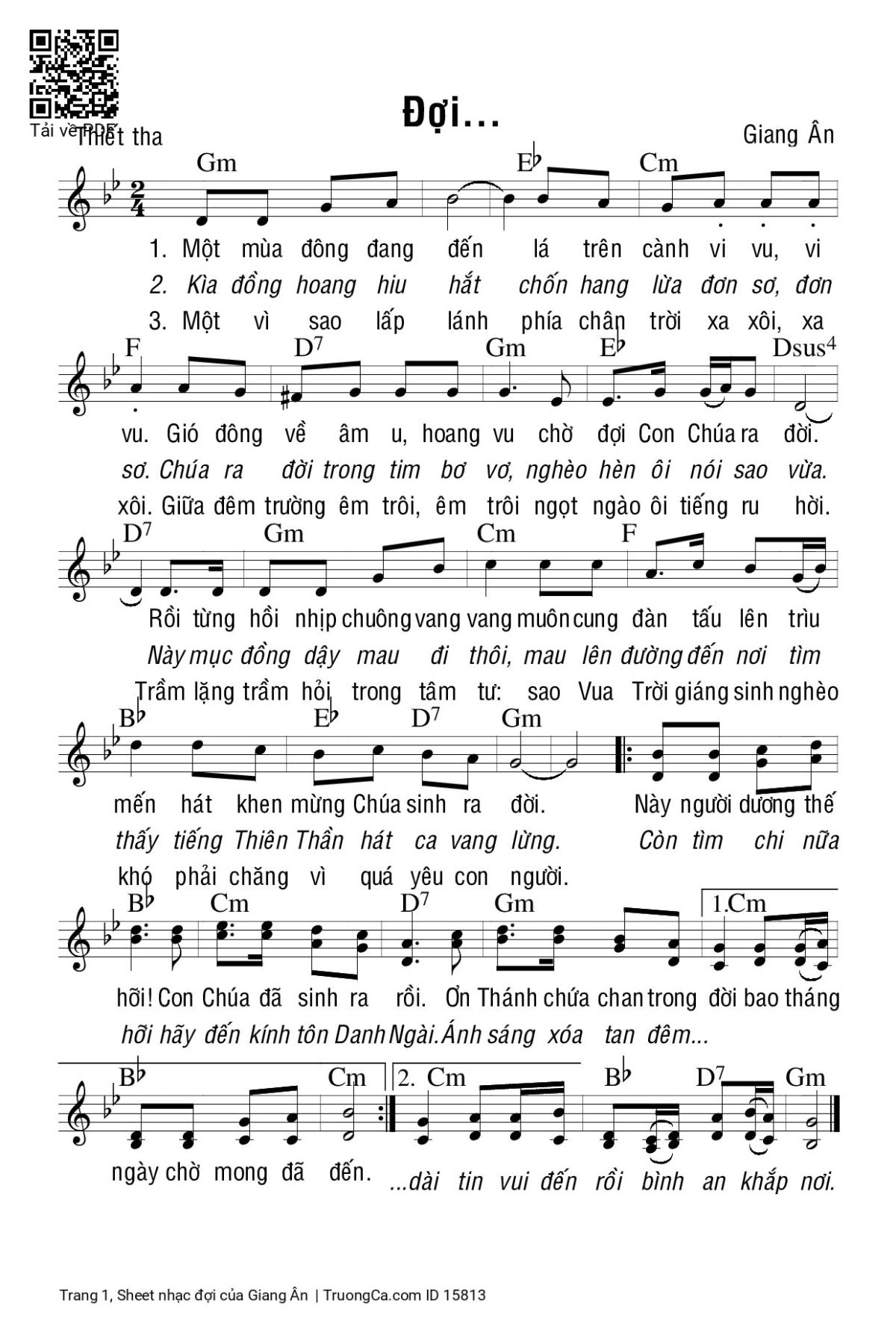 Điệp khúc. Này người dương thế hỡi Con Chúa sinh ra rồi. Ơn Thánh chứa chan trong đời bao tháng ngày chờ mong đã đến. Còn tìm chi nữa hỡi hãy đến kính tôn Danh Ngài. Ánh sáng xóa tan đêm dài tin vui đến rồi bình an khắp nơi.
