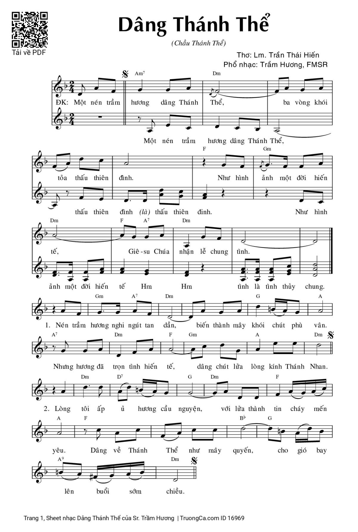 Transposition is the process of moving a song's melody and chords up or down in pitch by a constant interval. The direction of the transposition tool is indicated by a plus (+) sign for up and a minus (-) sign for down. Hover mouse over chords signs to see the chords chart of Dâng Thánh Thể song.