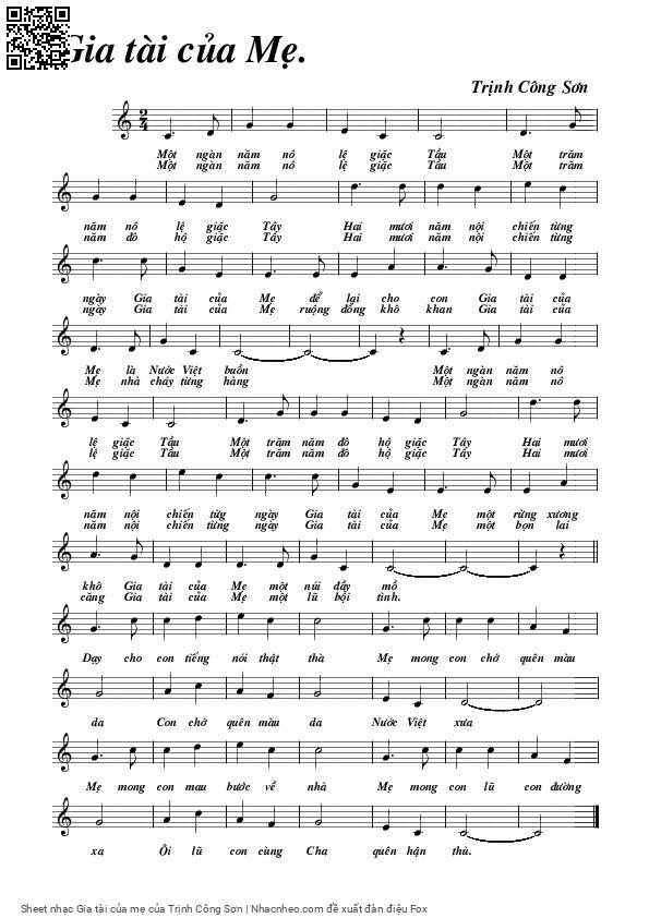 The Videos/audios Gia tài của mẹ by Trịnh Công Sơn were embed from Youtube, Musescore or the other 3rd links. Videos are subject to 3rd's copyright control and may be removed by YouTube's copyright rules and 3rd's policies or maybe included advertisements. If you cannot access to these songs, this mean that have been removed.