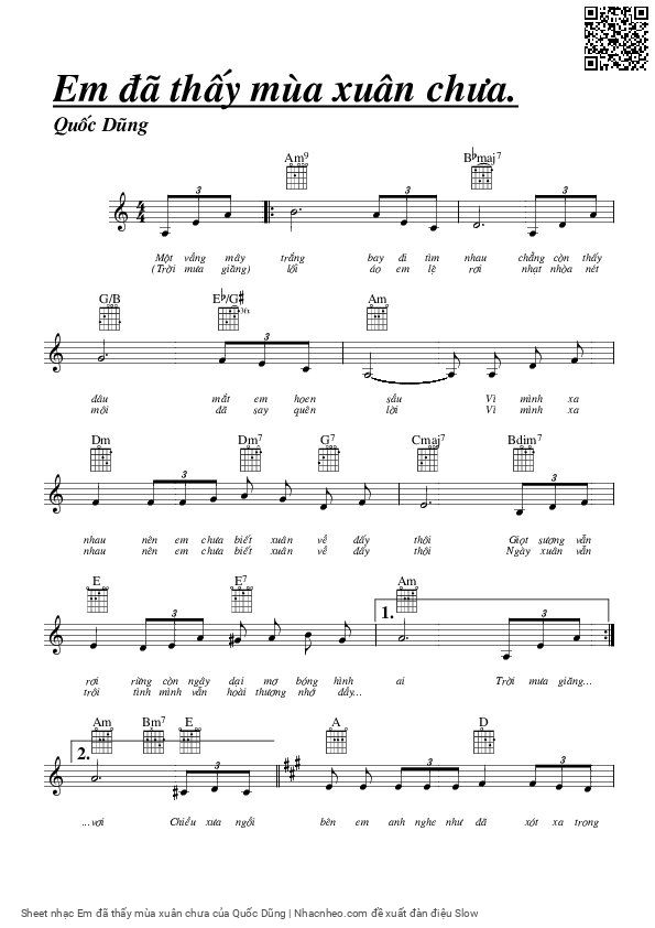 The Videos/audios Em đã thấy mùa xuân chưa by Quốc Dũng were embed from Youtube, Musescore or the other 3rd links. Videos are subject to 3rd's copyright control and may be removed by YouTube's copyright rules and 3rd's policies or maybe included advertisements. If you cannot access to these songs, this mean that have been removed.