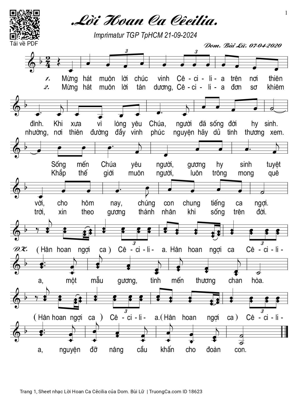 1. Mừng hát muôn lời chúc vinh Cêcilia trên nơi thiên đình. Khi xưa vì lòng yêu Chúa người đã sống đời hy sinh. Sống mến Chúa yêu người, gương hy sinh tuyệt vời cho hôm nay chúng con chung tiếng ca ngợi.