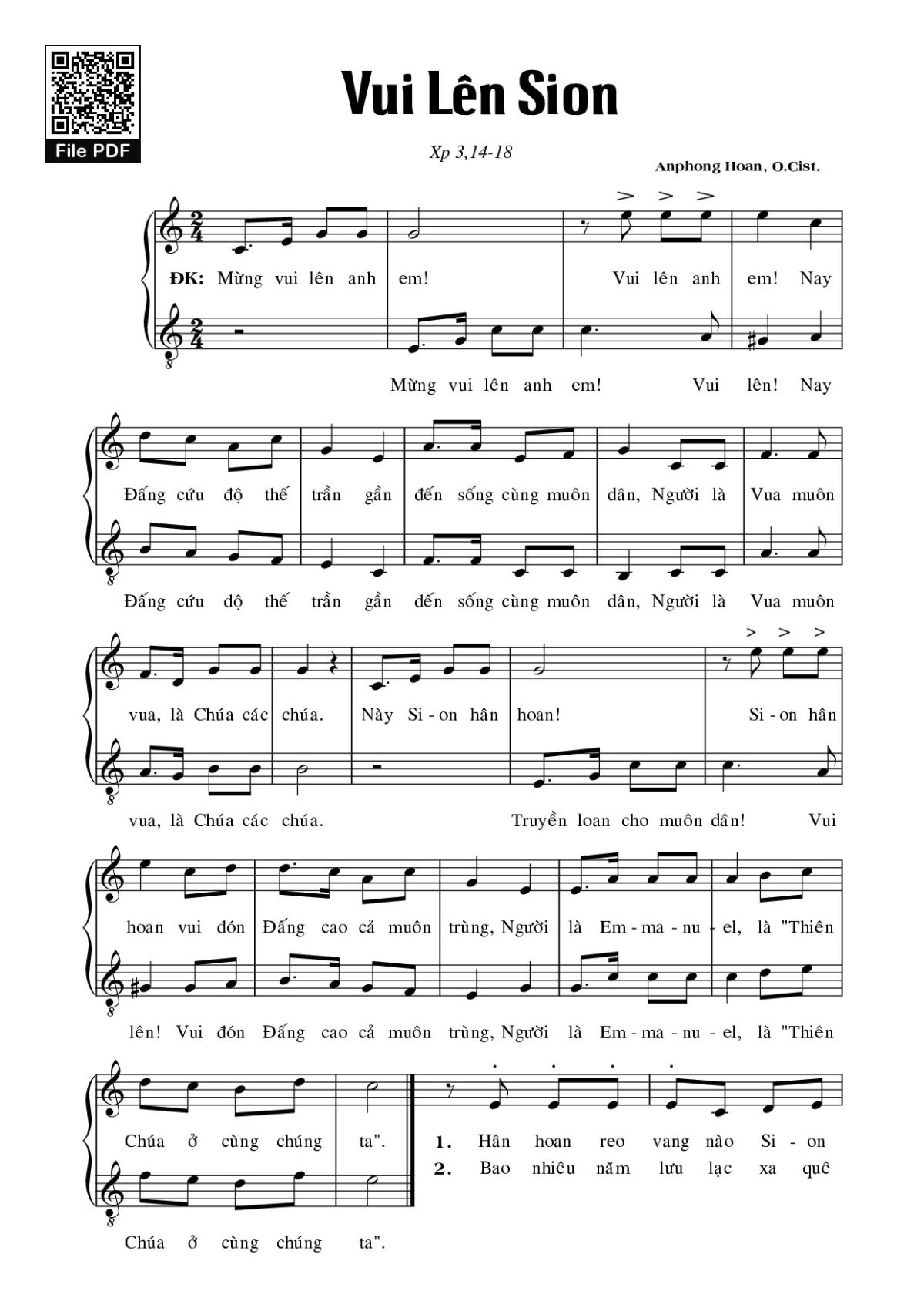 Điệp khúc: Mừng vui lên anh em! Vui lên anh em! Nay Đấng cứu độ thế trần gần đến sống cùng muôn dân, Người là Vua muôn vua, là Chúa các chúa. Này Si-on hân hoan! Si-on hân hoan vui đón Đấng cao cả muôn trùng, Người là Em-ma-nu-el, là “Thiên Chúa ở cùng chúng ta”.