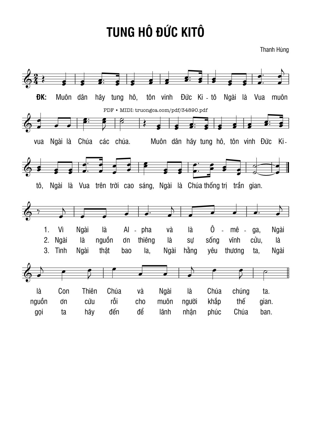 Điệp khúc: Muôn dân hãy tung hô, tôn vinh Đức Ki-tô. Ngài là Vua muôn vua Ngài là Chúa các chúa. Muôn dân hãy tung hô, tôn vinh Đức Ki-tô, Ngài là Vua trên trời cao sáng, Ngài là Chúa thống trị trần gian.