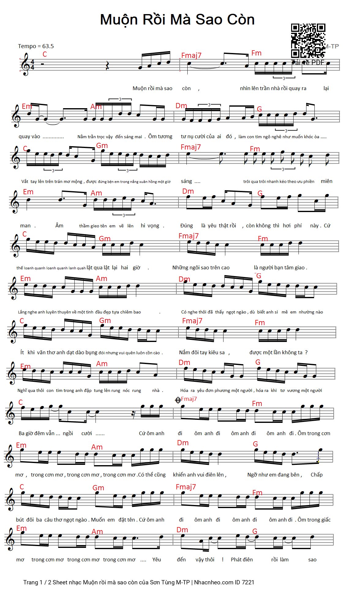 Transposition is the process of moving a song's melody and chords up or down in pitch by a constant interval. The direction of the transposition tool is indicated by a plus (+) sign for up and a minus (-) sign for down. Hover mouse over chords signs to see the chords chart of Muộn rồi mà sao còn song.