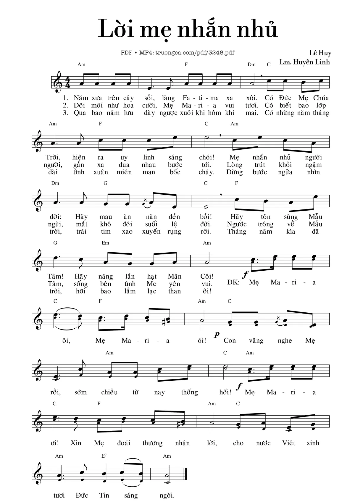 Lm. Huyền Linh Năm xưa trên cây sồi làng Fatima xa xôi [PDF] [Sheet] [Lyrics] [Mp4/Midi]