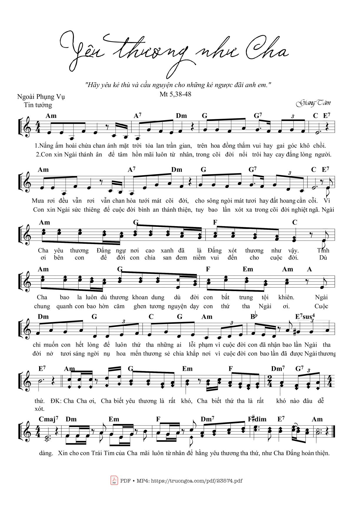 Transposition is the process of moving a song's melody and chords up or down in pitch by a constant interval. The direction of the transposition tool is indicated by a plus (+) sign for up and a minus (-) sign for down. Hover mouse over chords signs to see the chords chart of Yêu Thương Như Cha song.