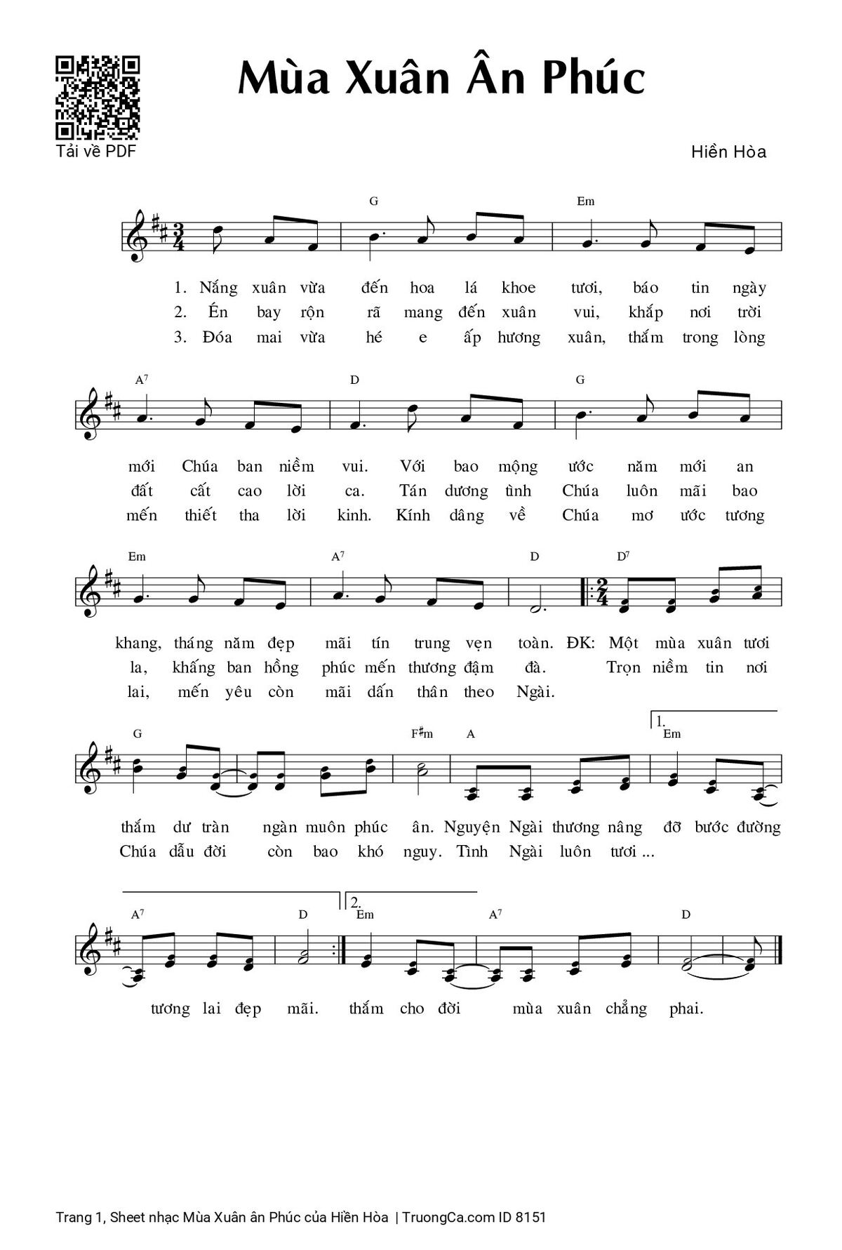Hiền Hòa Nắng xuân vừa đến hoa lá khoe tươi báo tin ngày mới Chúa ban niềm vui [PDF] [Sheet] [Lyrics] [Mp4/Midi]