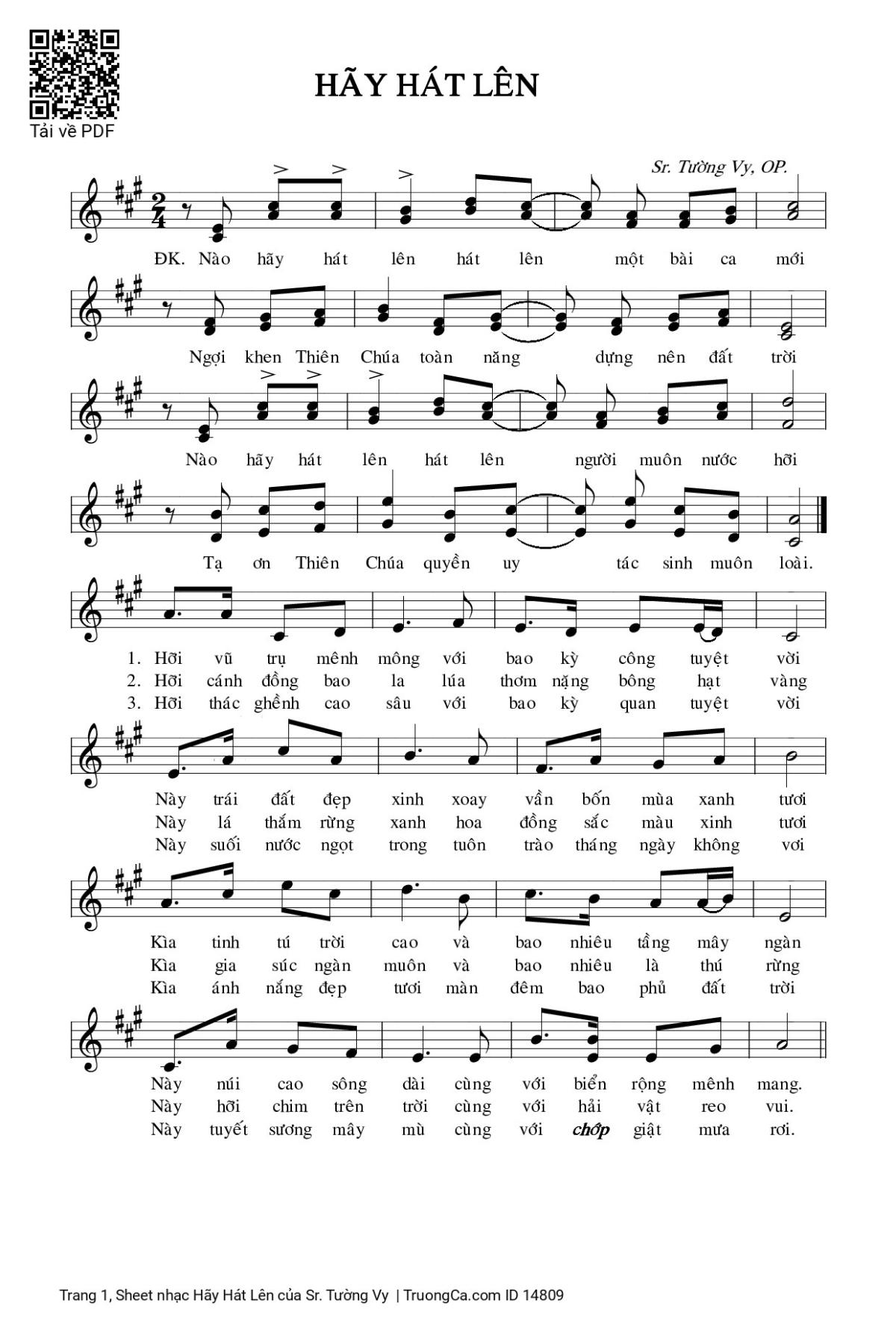 Điệp khúc. Nào hãy hát lên hát lên một bài ca mới. Ngợi khen Thiên Chúa toàn năng dựng nên đất trời. Nào hãy hát lên hát lên người muôn nước hỡi. Tạ ơn Thiên Chúa quyền uy tác sinh muôn loài.