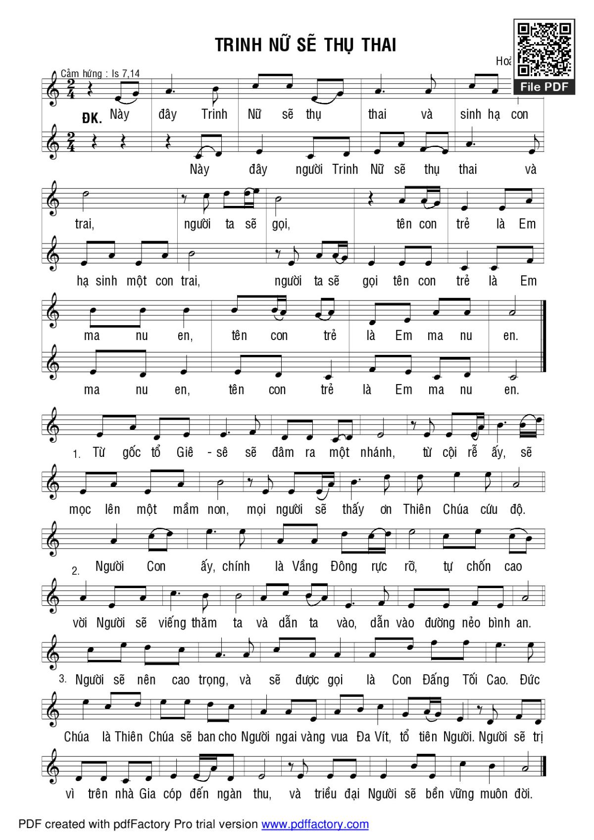 Điệp khúc: Này đây Trinh Nữ sẽ thụ thai và sinh hạ con trai, người ta sẽ gọi, tên Con Trẻ là Em-ma-nu-el, tên Con Trẻ là Em-ma-nu-el.