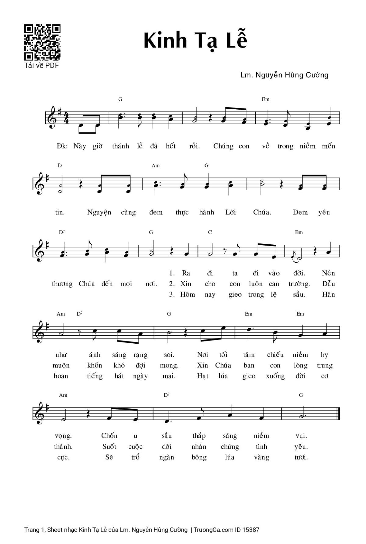 Transposition is the process of moving a song's melody and chords up or down in pitch by a constant interval. The direction of the transposition tool is indicated by a plus (+) sign for up and a minus (-) sign for down. Hover mouse over chords signs to see the chords chart of Kinh Tạ Lễ song.
