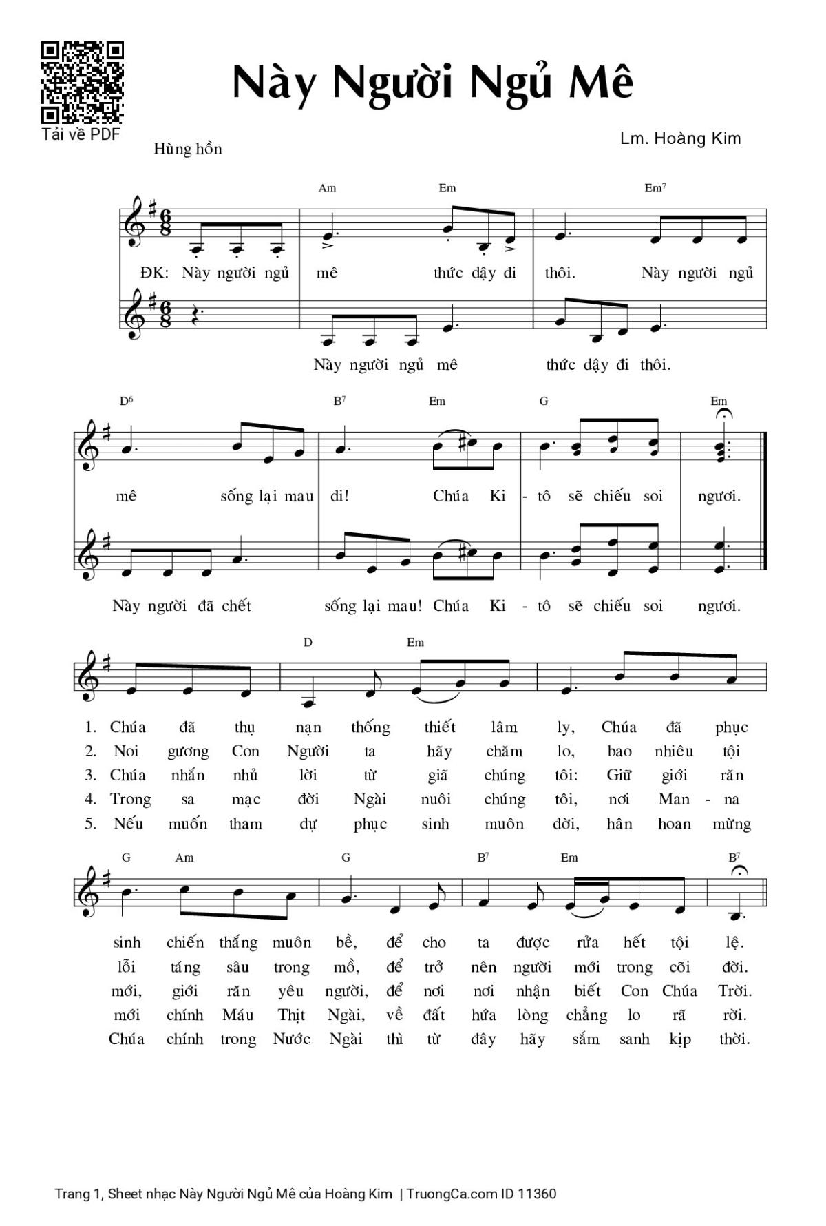 Hoàng Kim Này người ngủ mê thức dậy đi thôi Này người ngủ mê sống lại mau đi [PDF] [Sheet] [Lyrics] [Mp4/Midi]