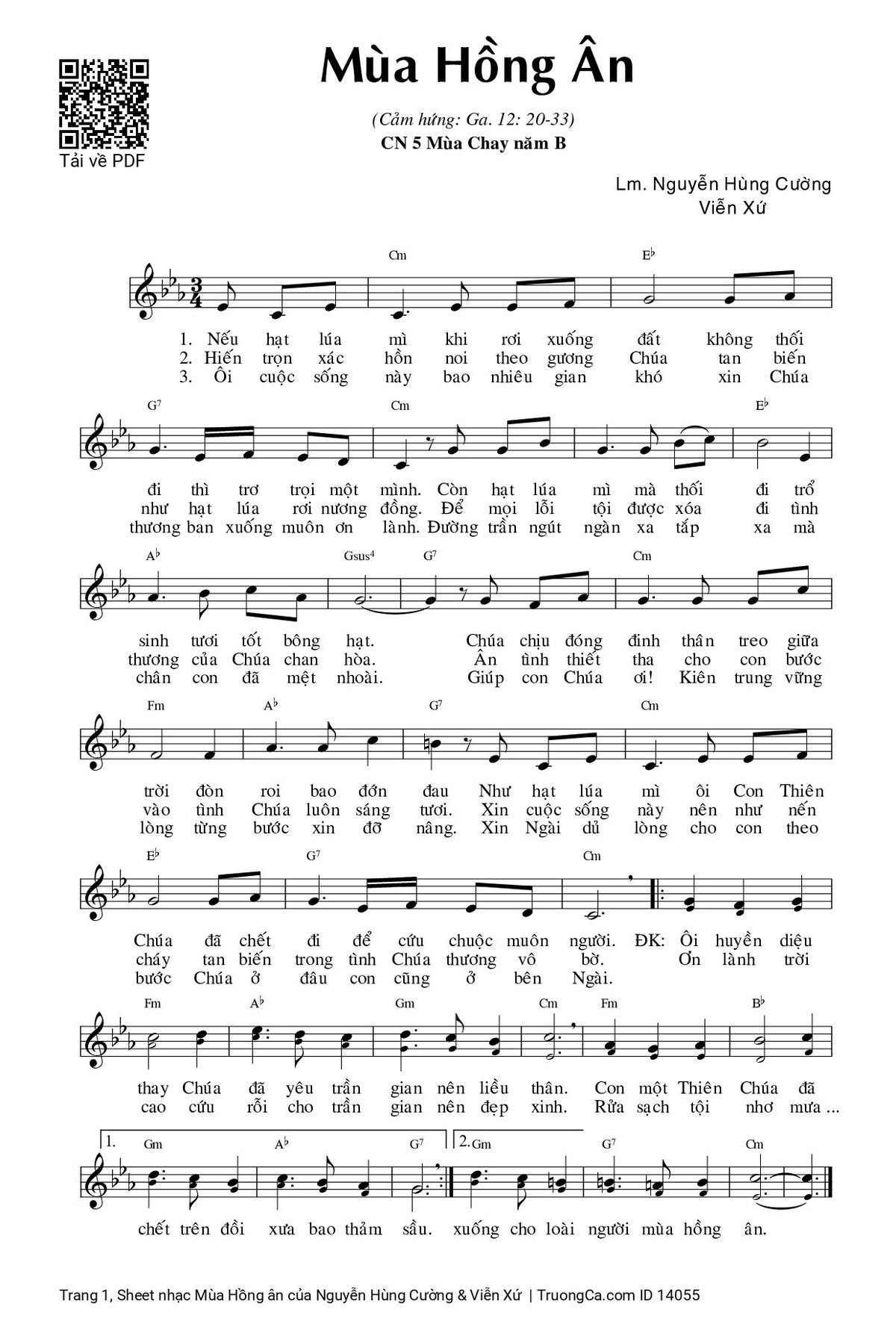 Transposition is the process of moving a song's melody and chords up or down in pitch by a constant interval. The direction of the transposition tool is indicated by a plus (+) sign for up and a minus (-) sign for down. Hover mouse over chords signs to see the chords chart of Mùa Hồng ân song.