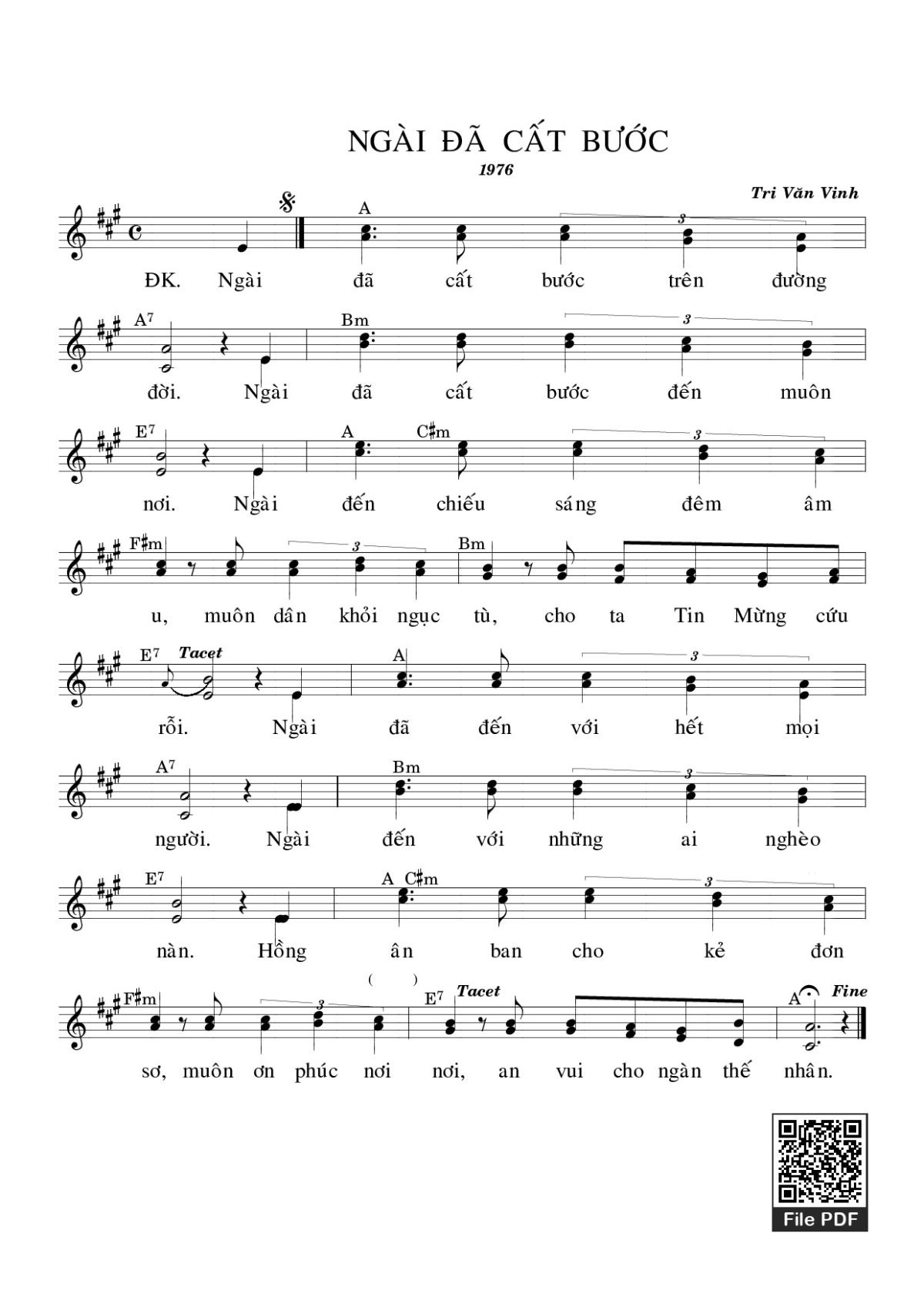 Điệp khúc. Ngài đã cất bước trên đường đời. Ngài đã cất bước đến muôn nơi. Ngài đến chiếu sáng đêm âm u, muôn dân khỏi ngục tù, cho ta Tin Mừng cứu rỗi. Ngài đã đến với hết mọi người. Ngài đến với những ai nghèo nàn. Hồng ân ban cho kẻ đơn sơ, muôn ơn phúc nơi nơi, an vui cho ngàn thế nhân.