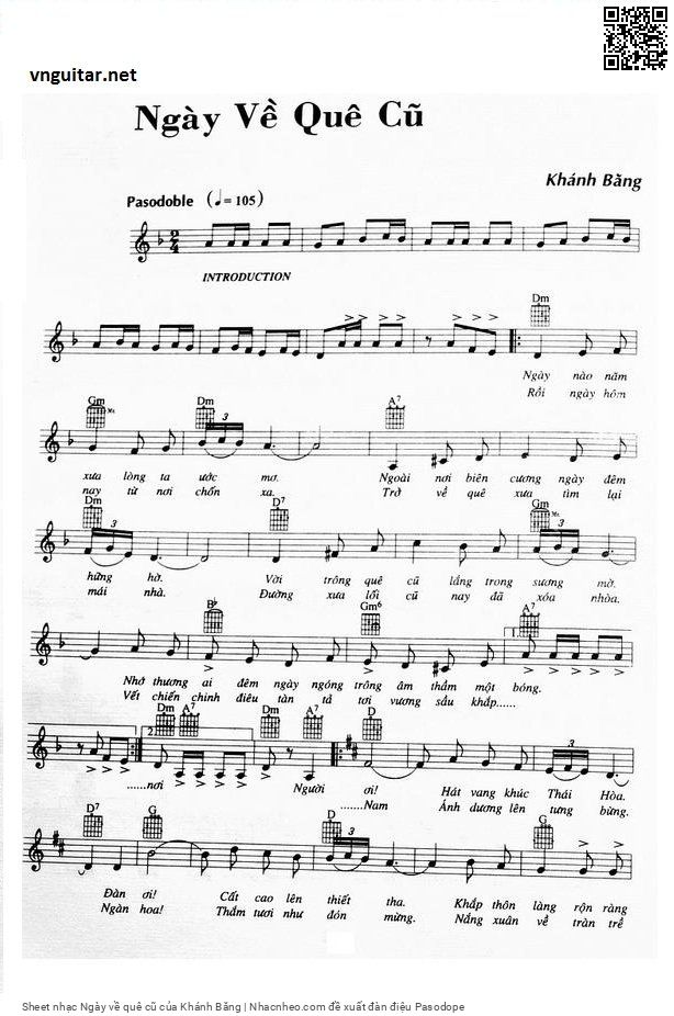 Transposition is the process of moving a song's melody and chords up or down in pitch by a constant interval. The direction of the transposition tool is indicated by a plus (+) sign for up and a minus (-) sign for down. Hover mouse over chords signs to see the chords chart of Ngày về quê cũ song.
