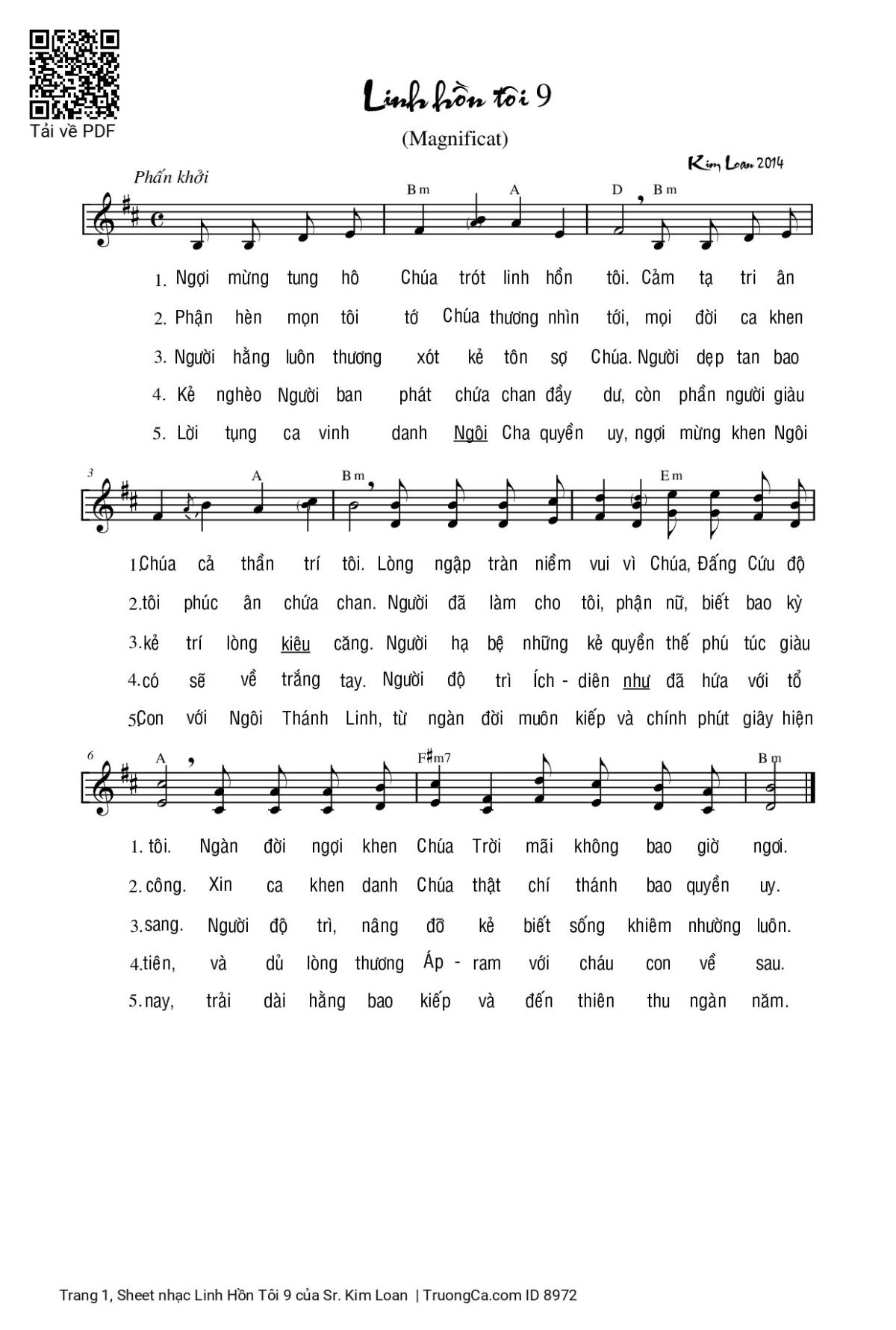 1/ Ngợi mừng tung hô Chúa trót linh hồn tôi, cảm tạ tri ân Chúa cả thần trí tôi. Lòng ngập tràn niềm vui vì Chúa, Đấng cứu độ tôi, ngàn đời ngợi khen Chúa Trời mãi không bao giờ ngơi.