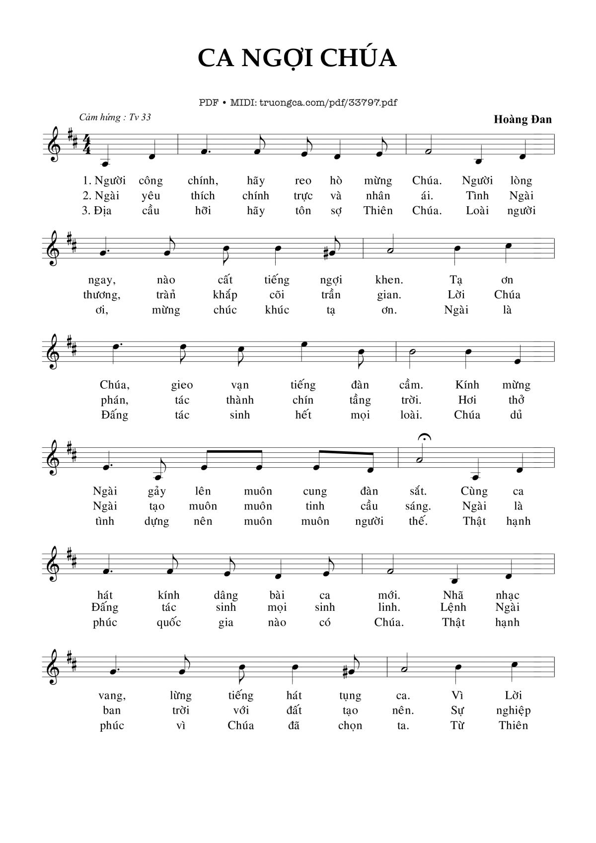 1. Người công chính hãy reo hò mừng Chúa. Người lòng ngay nào cất tiếng ngợi khen. Tạ ơn Chúa, gieo vạn tiếng đàn cầm. Kính mừng Ngài gảy lên muôn cung đàn sắt. Cùng ca hát, kính dâng bài ca mới. Nhã nhạc vang, lừng tiếng hát tụng ca. Vì Lời Chúa rất ngay chính vững bền. Những việc Ngài thật quá ư vĩ đại.