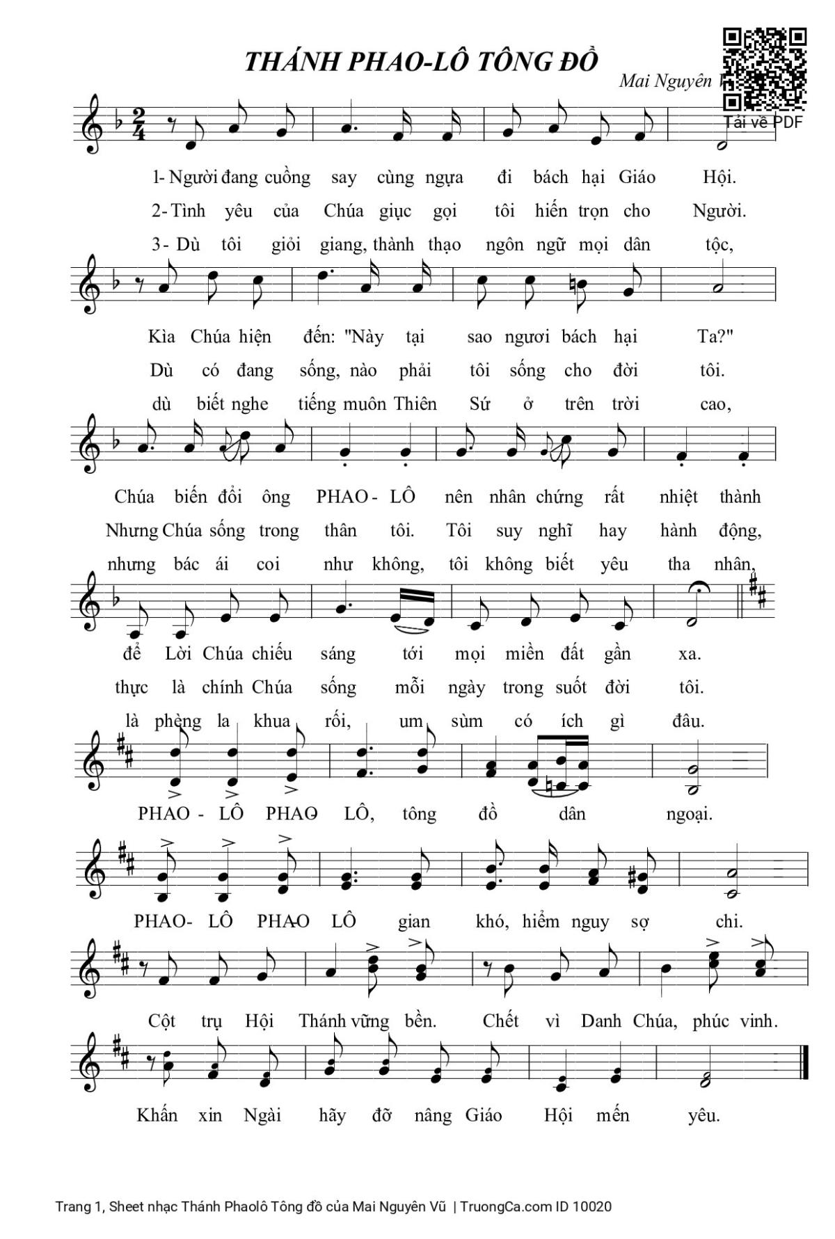 Điệp khúc. Phaolô Phaolô, tông đồ dân ngoại. Phaolô Phaolô gian khó, hiểm nguy sợ chi. Cột trụ Hội Thánh vững bền. Chết vì Danh Chúa, phúc vinh. Khấn xin Ngài hãy đỡ nâng Giáo Hội mến yêu.