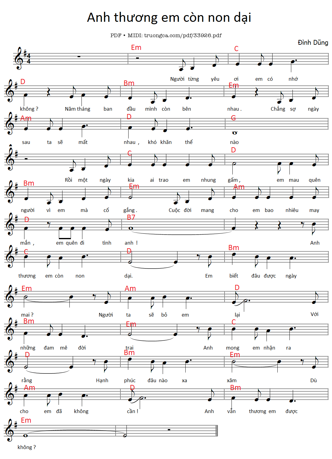 Transposition is the process of moving a song's melody and chords up or down in pitch by a constant interval. The direction of the transposition tool is indicated by a plus (+) sign for up and a minus (-) sign for down. Hover mouse over chords signs to see the chords chart of Anh thương em còn non dại song.