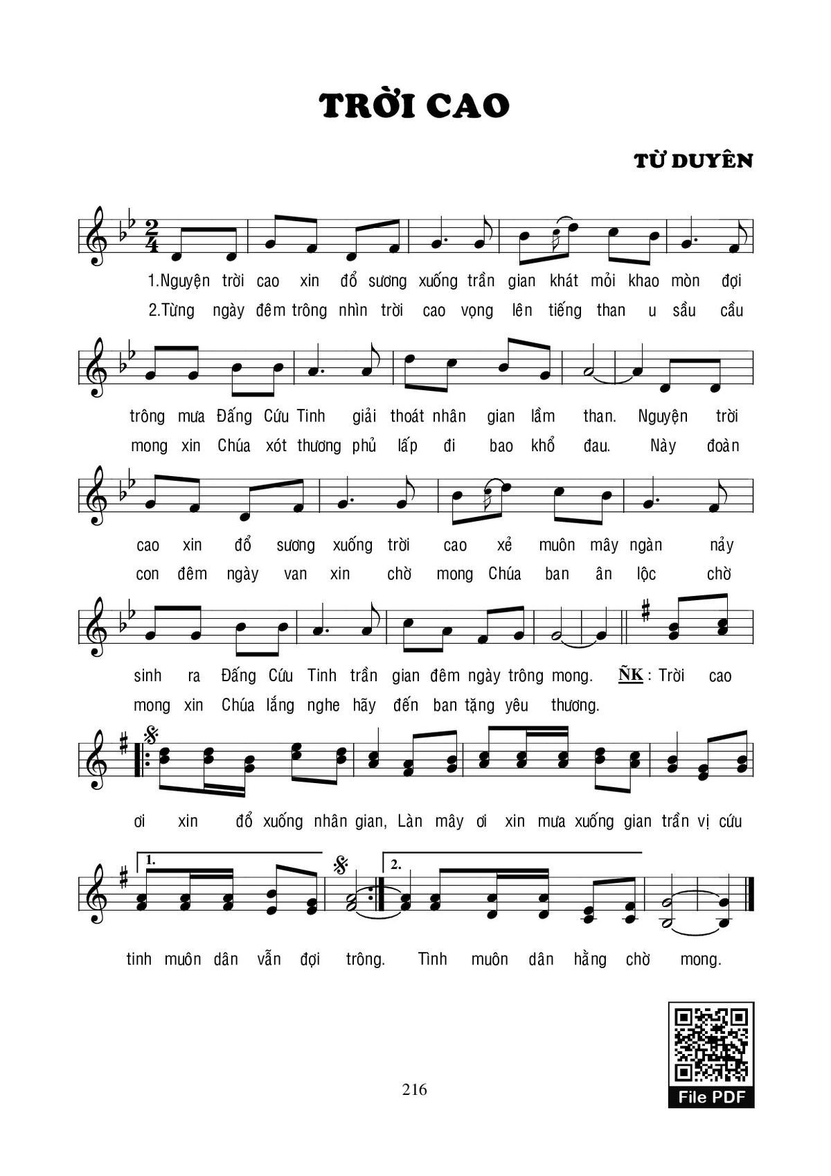 Điệp khúc. Trời cao ơi xin đổ xuống nhân gian, Làn mây ơi xin mưa xuống gian trần vị cứu tinh muôn dân vẫn đợi trông. Trời cao ơi xin đổ xuống nhân gian, Làn mây ơi xin mưa xuống gian trần vị cứu tinh muôn dân hằng chờ mong.