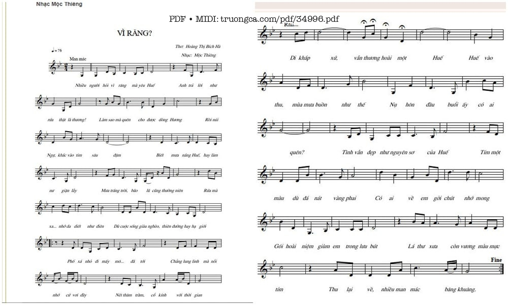 Mộc Thiêng Nhiều người hỏi vì răng mà yêu Huế Anh trả lời như rứa thật là thương [PDF] [Sheet] [Lyrics] [Mp4/Midi]