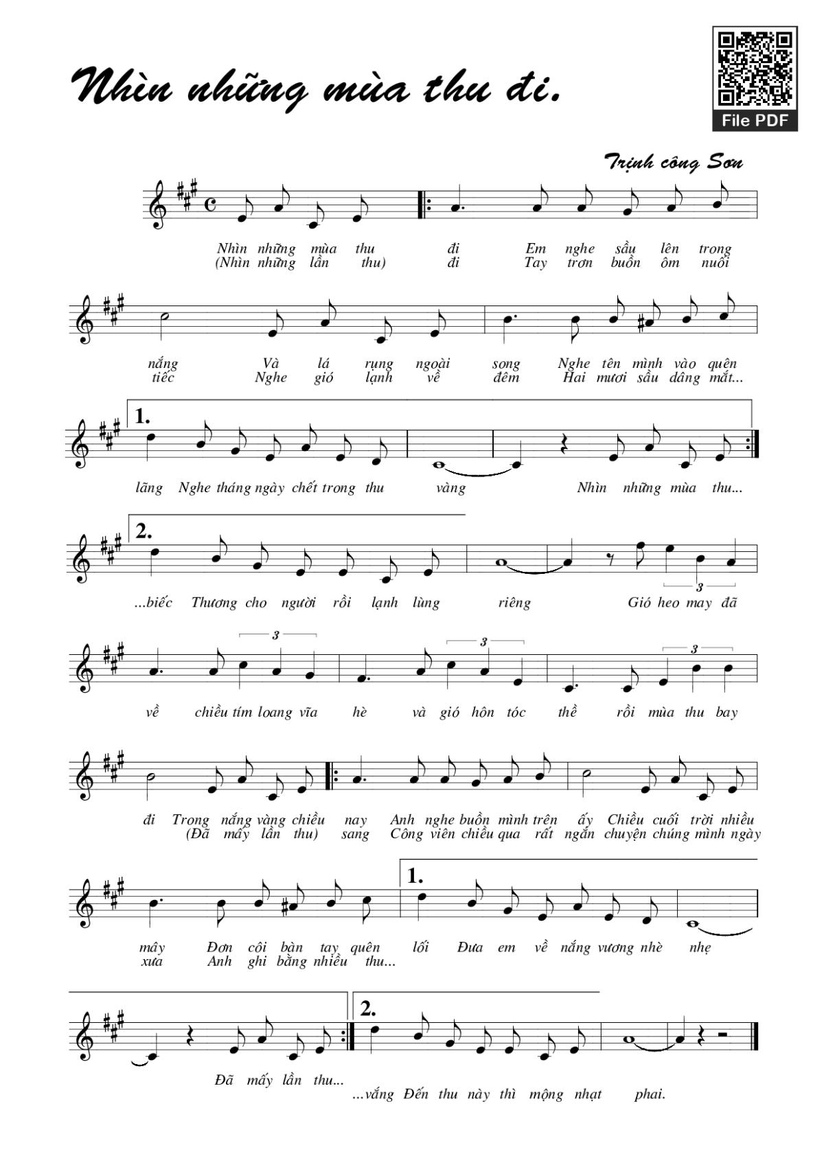 Trịnh Công Sơn Nhìn những mùa thu đi em nghe sầu vương trong nắng [PDF] [Sheet] [Lyrics] [Mp4/Midi]