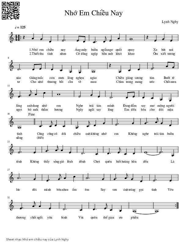 Lynh Nghy Nhớ em chiều nay Áng mây buồn ngẩn ngơ quắt quay [PDF] [Sheet] [Lyrics] [Mp4/Midi]