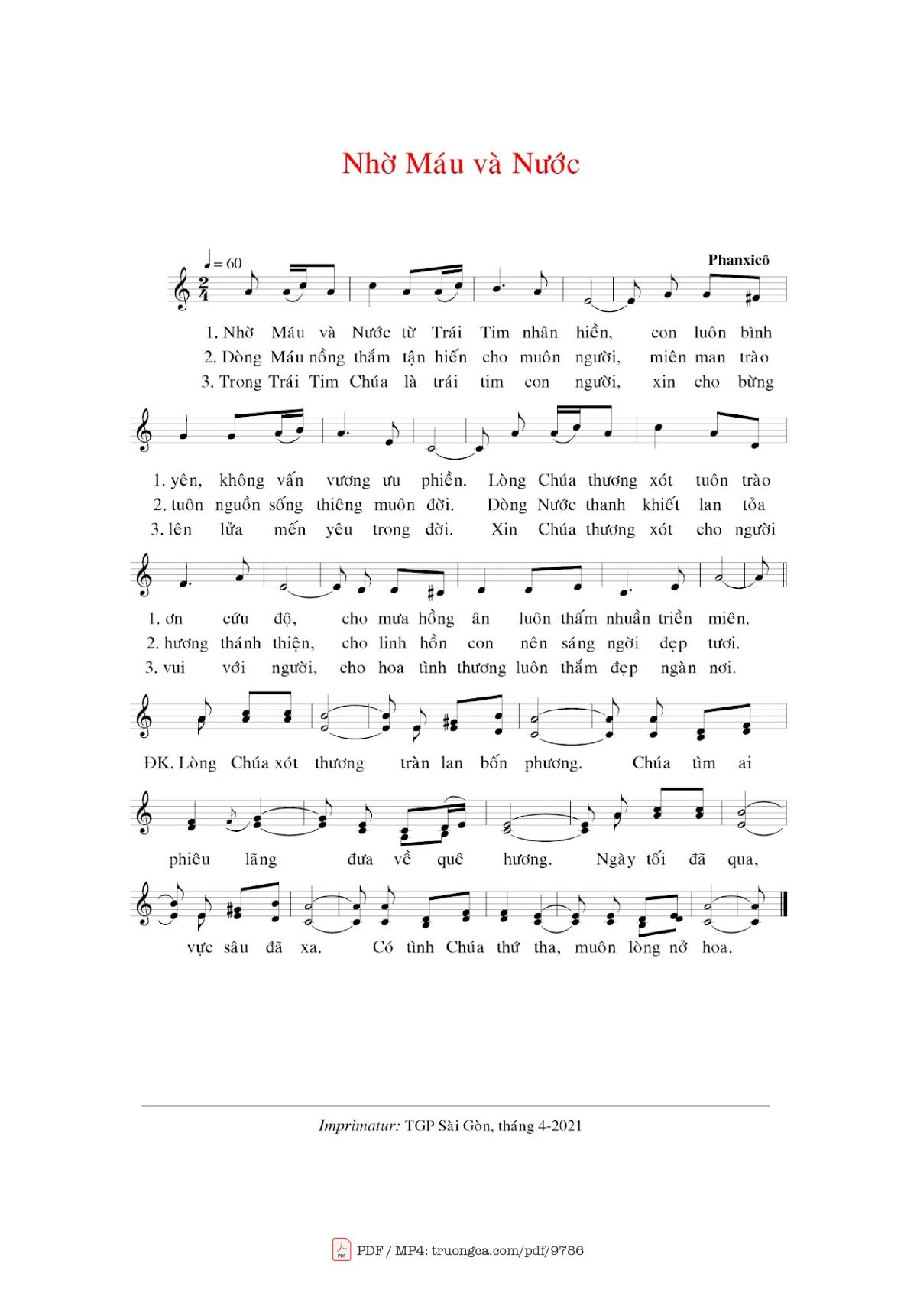 1/ Nhờ Máu và Nước từ Trái Tim nhân hiền, con luôn bình yên không vấn vương ưu phiền. Lòng Chúa thương xót tuôn trào ơn cứu độ, cho mưa hồng ân luôn thấm nhuần triền miên.