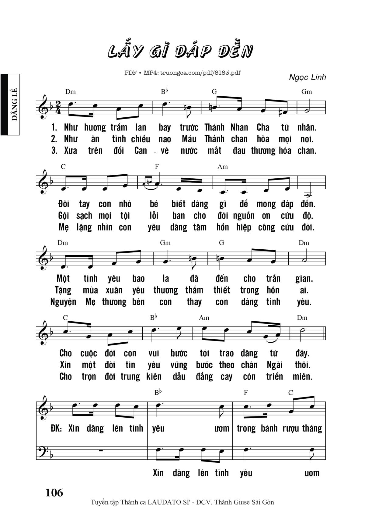 ĐK. Xin dâng lên tình yêu ươm trong bánh rượu tháng ngày. Cùng bao hy sinh trần gian mong ước đáp đền hồng ân.