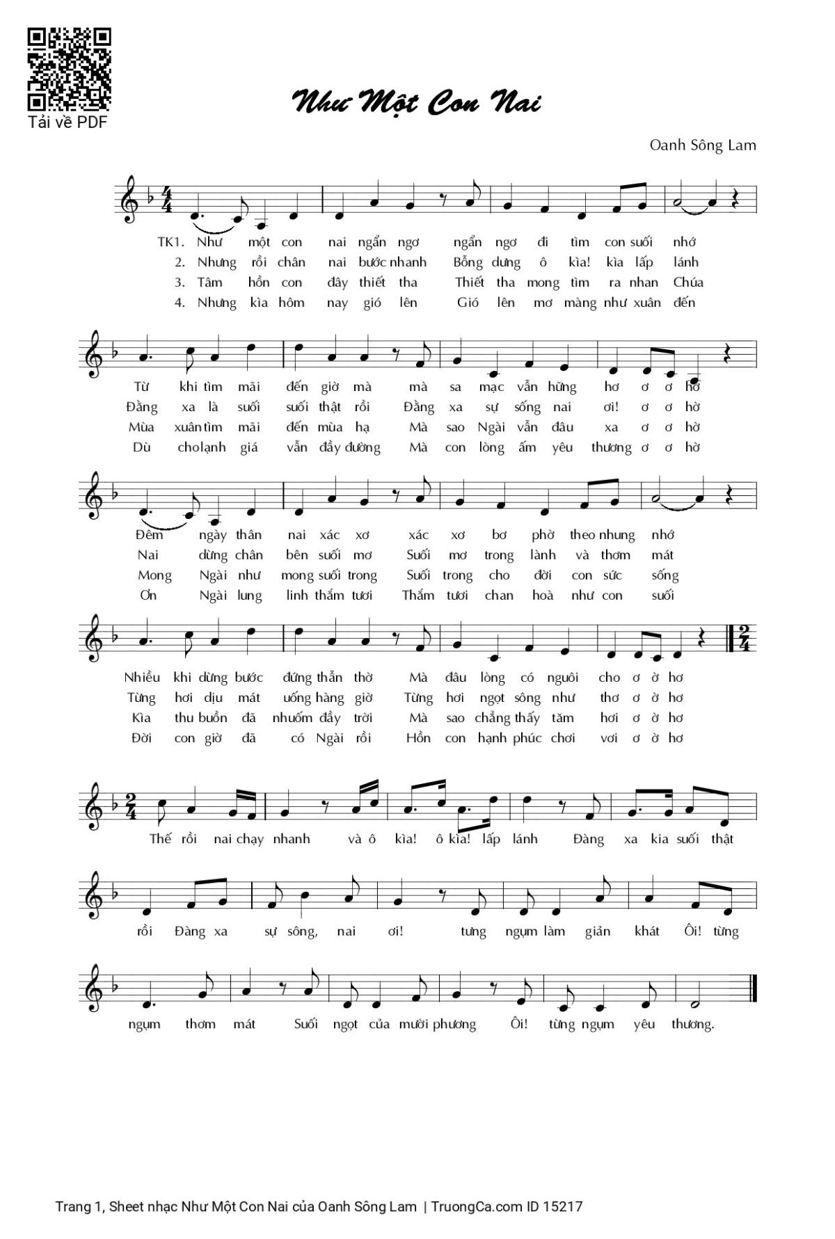 1. Như một con nai ngẩn ngơ ngẩn ngơ đi tìm con suối nhớ. Từ khi tìm mãi đến giờ mà, mà sa mạc vẫn hững hơ ơ ơ hờ. Đêm ngày thân nai xác xơ, xác xơ bơ phờ theo nhung nhớ, nhiều khi dừng bước đứng thẫn thờ, mà đâu lòng có nguôi cho ơ ờ hơ.