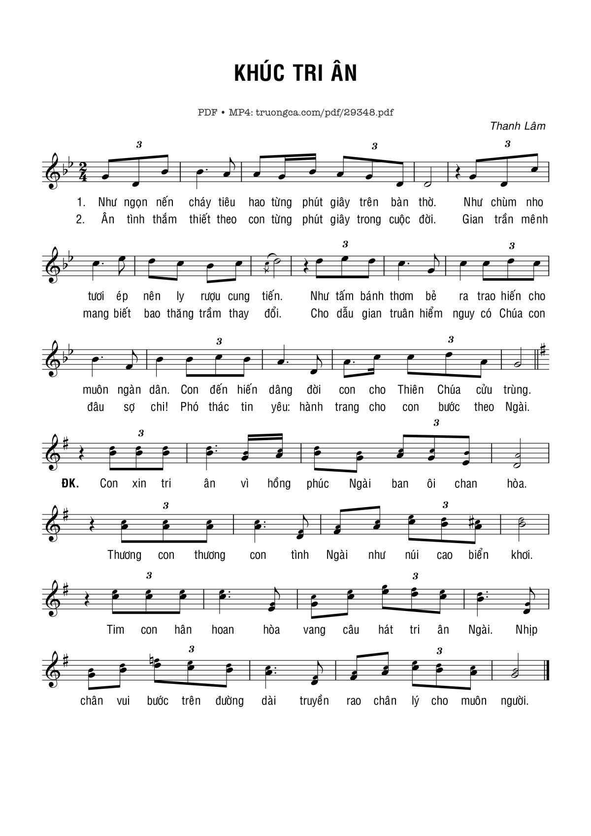 Điệp khúc. Con xin tri ân vì hồng phúc Ngài ban ôi chan hòa. Thương con thương con, tình Ngài như núi cao biển khơi. Tim con hân hoan hòa vang câu hát tri ân Ngài. Nhịp chân vui bước trên đường dài, truyền rao chân lý cho muôn người.