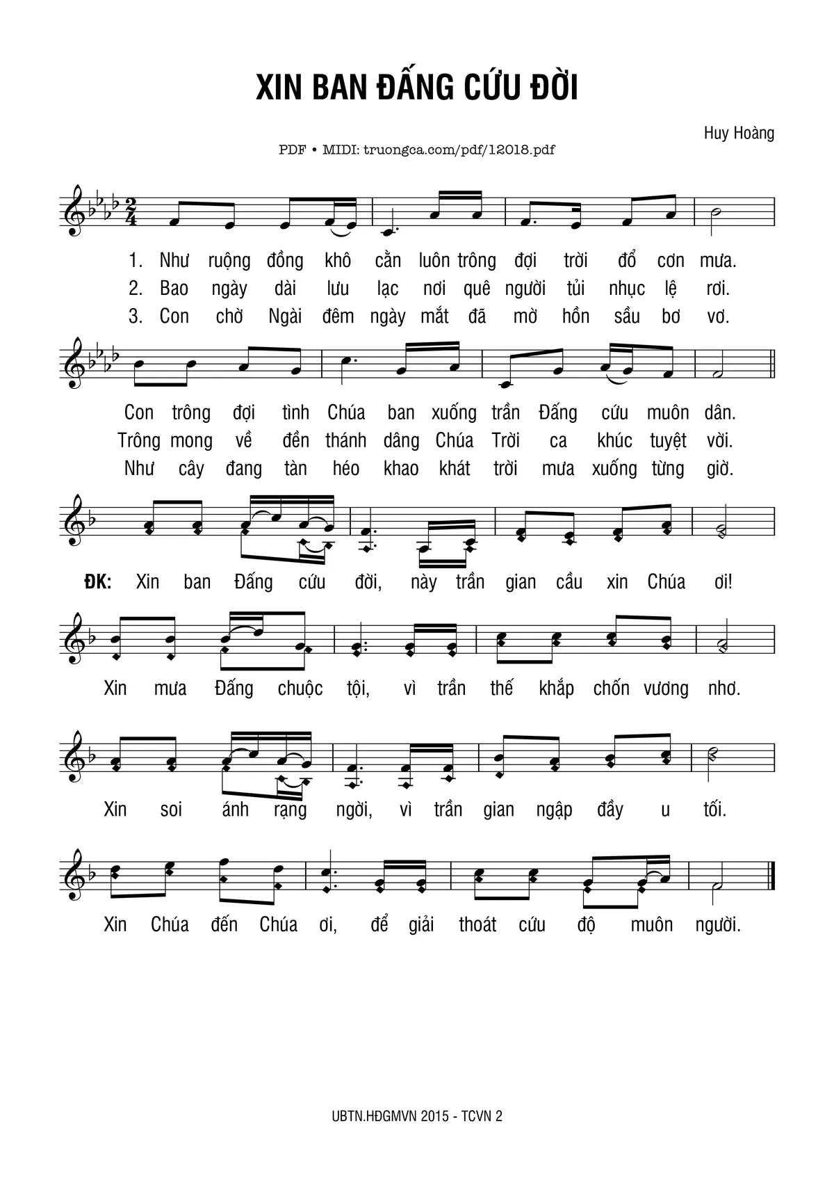 Điệp khúc. Xin ban Đấng cứu đời, này trần gian cầu xin Chúa ơi. Xin mưa Đấng chuộc tội vì trần thế khắp chốn vương nhơ. Xin soi ánh rạng ngời vì trần gian ngập đầy u tối. Xin Chúa đến Chúa ơi để giải thoát cứu độ muôn người.