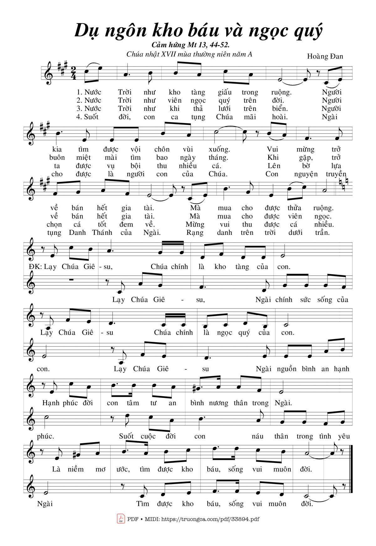 1. Nước Trời như kho tàng giấu trong ruộng. Người kia tìm được vội chôn vùi xuống Vui mừng trở về bán hết gia tài. Mà mua cho được thuở ruộng