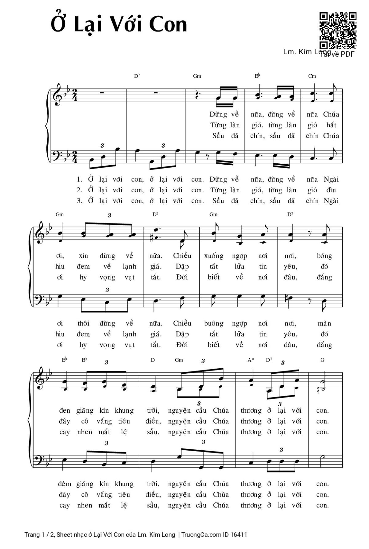 3. Ở lại với con, ở lại với con. Sầu đã chín, sầu đã chín Ngài ơi, hy vọng vụt tắt. Đời biết về nơi đâu, đắng cay nhen mắt lệ sầu, nguyện cầu Chúa thương ở lại với con.