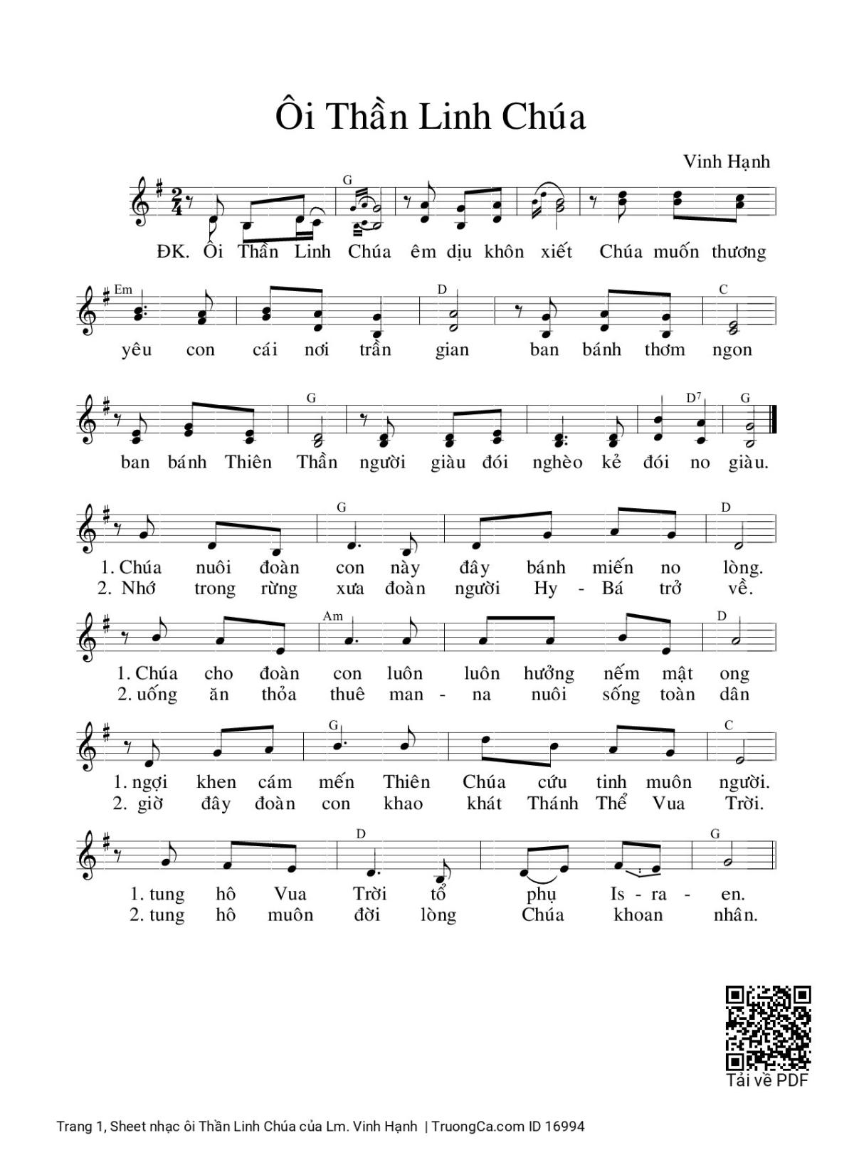Điệp khúc: Ôi Thần Linh Chúa, êm dịu khôn xiết, Chúa muốn thương yêu con cái nơi trần gian, ban bánh thơm ngon, ban bánh Thiên Thần. Người giàu đói nghèo, kẻ đói no giàu.