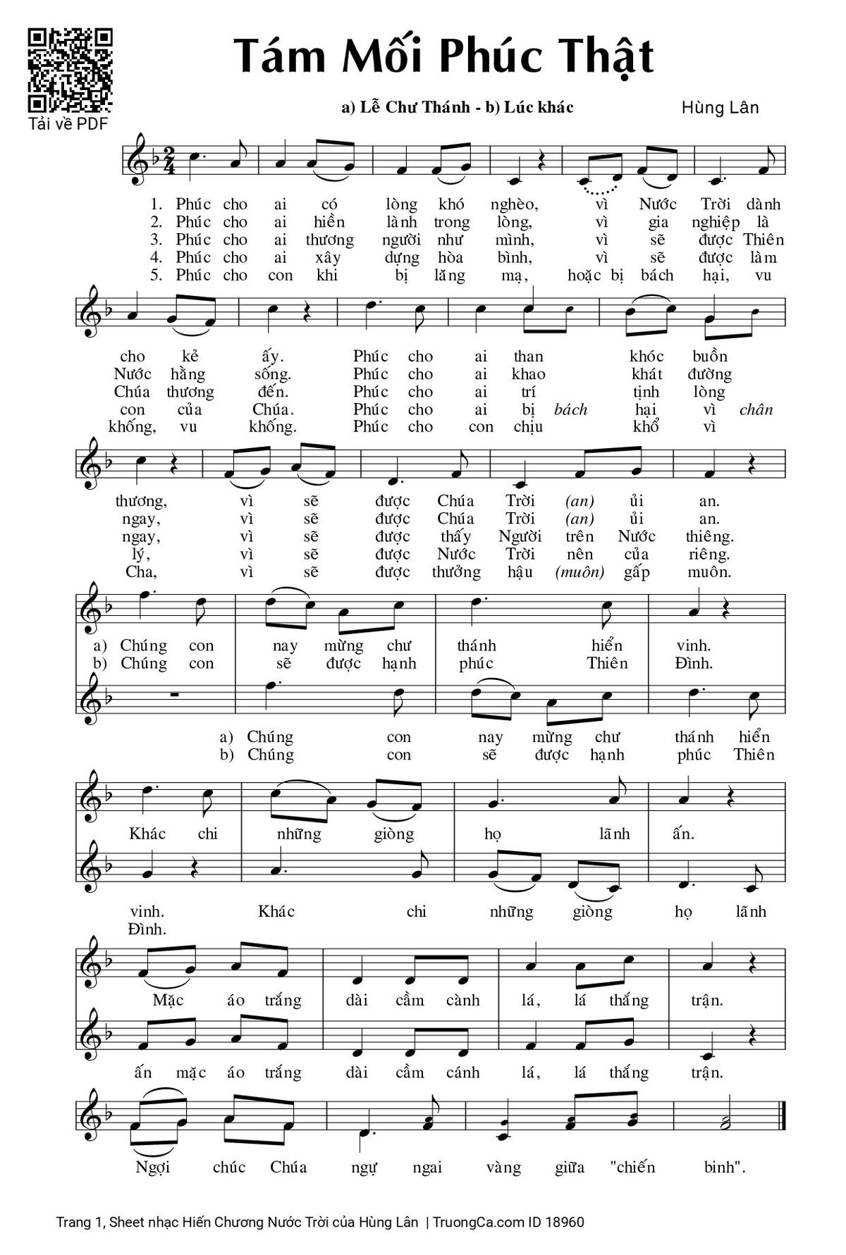1. Phúc cho ai có lòng khó nghèo, vì Nước Trời dành cho kẻ ấy. Phúc cho ai than khóc buồn thương, vì sẽ được Chúa Trời (an) ủi an.