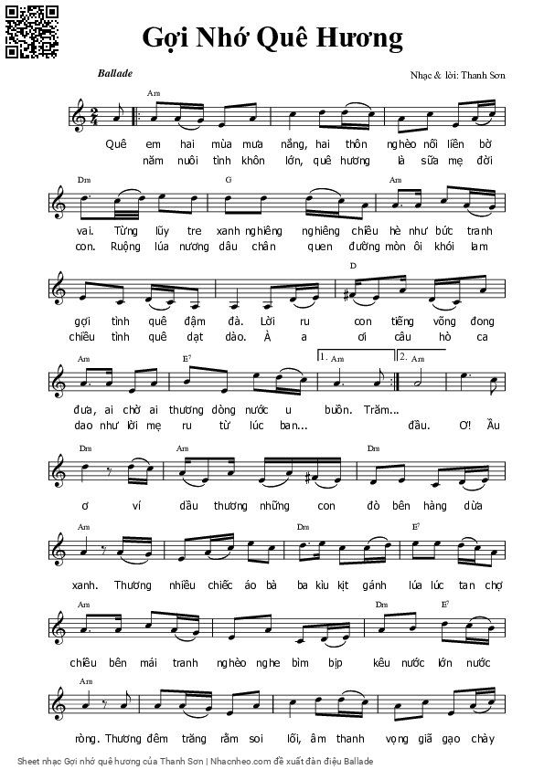 Thanh Sơn Quê em hai mùa mưa nắng Hai thôn nghèo nối liền bờ đê [PDF] [Sheet] [Lyrics] [Mp4/Midi]