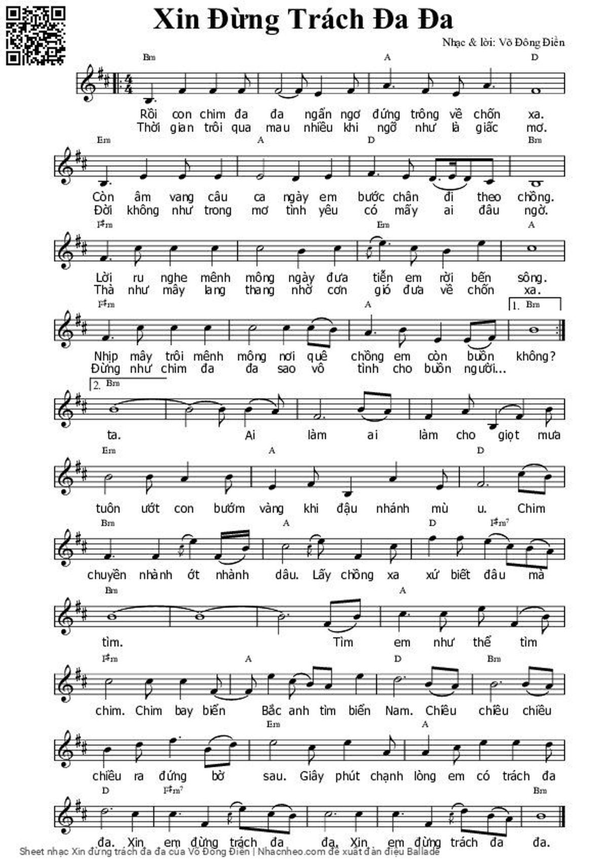 Võ Đông Điền Rồi con chim đa đa Ngẩn ngơ đứng trông về chốn xa [PDF] [Sheet] [Lyrics] [Mp4/Midi]