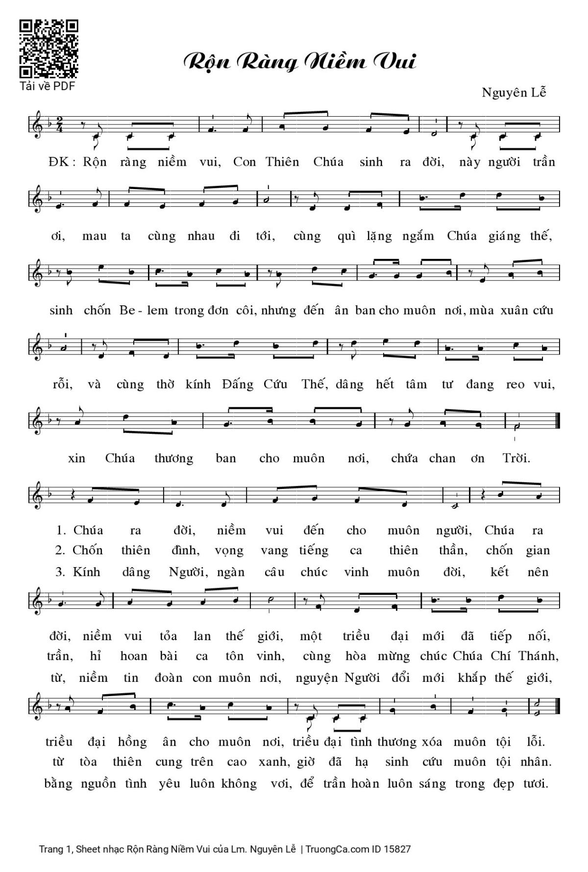 Điệp khúc. Rộn ràng niềm vui, Con Thiên Chúa sinh ra đời. Này người trần ơi mau mau ta cùng đi tới. Cùng quỳ lặng ngắm Chúa giáng thế, sinh chốn Bêlem trong đơn côi, nhưng đến ân ban cho muôn nơi mùa xuân cứu rỗi. Và cùng thờ kính Đấng Cứu Thế, dâng hết tâm tư đang reo vui, xin Chúa thương ban cho muôn nơi, chứa chan ơn Trời.