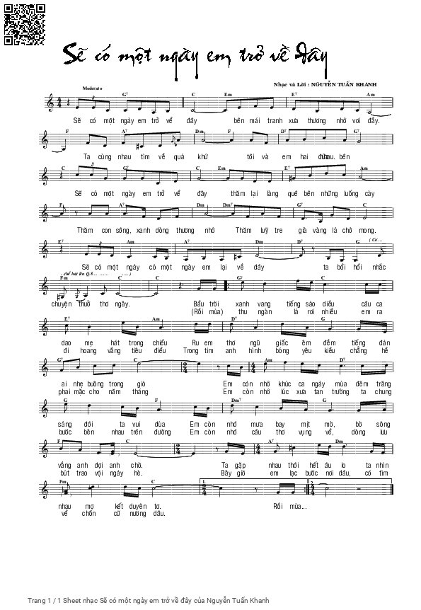 Nguyễn Tuấn Khanh Sẽ có một ngày em trở về đây Bên mái tranh xưa thương nhớ vơi đầy [PDF] [Sheet] [Lyrics] [Mp4/Midi]
